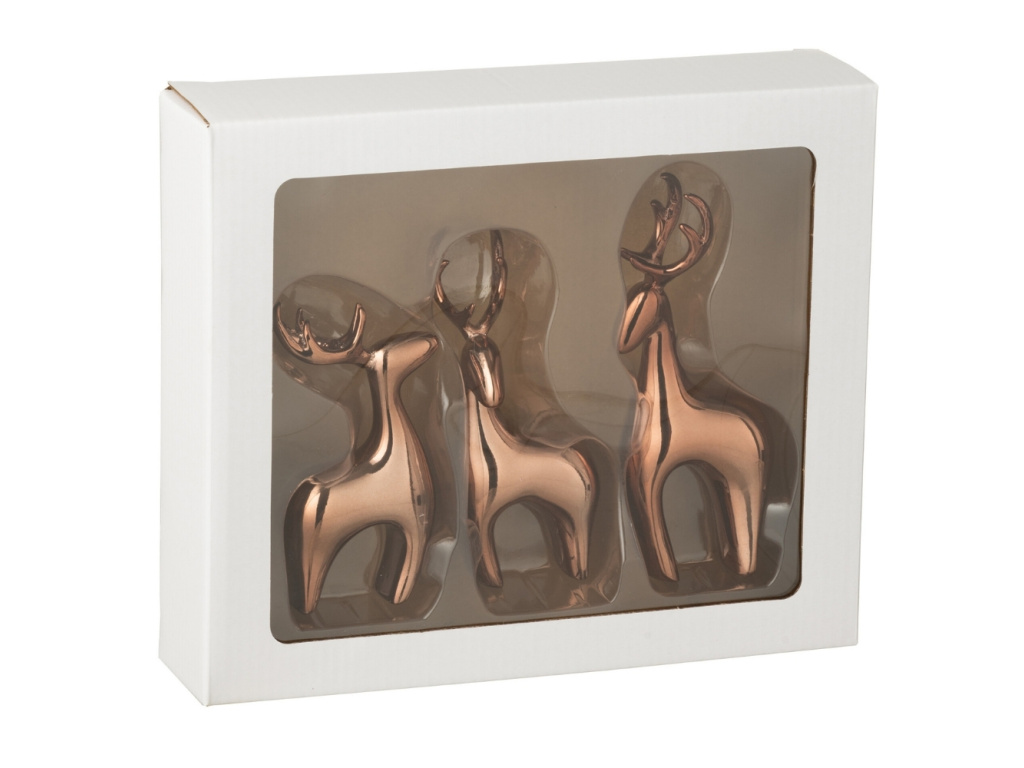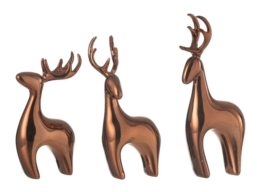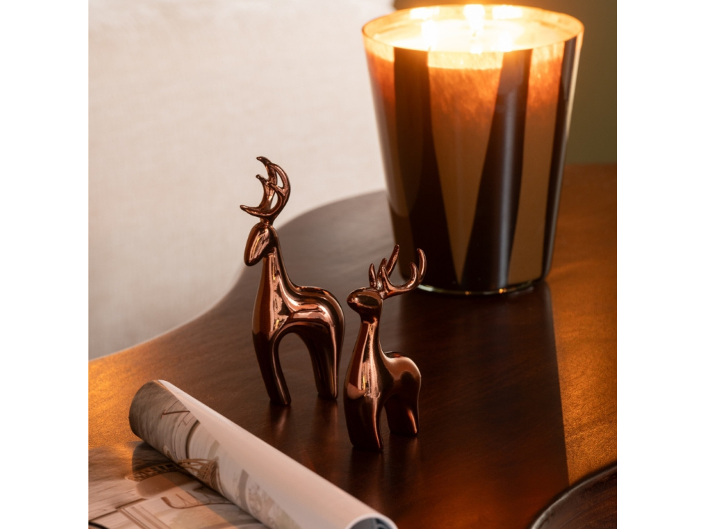 Set tří měděných sošek Reindeer vnese do interiéru šarm i hravou eleganci. Jejich tvar zaujme jemně stylizovanými liniemi, které působí moderně a zároveň půvabně. Povrch v teplém měděném tónu podtrhne oblý design a svým jemným leskem dodá dekoraci luxusní i sváteční atmosféru. Soby skvěle vyniknou na svátečně prostřeném stole i na poličce, kde podtrhnou kouzlo Vánoc. Tento originální prvek propojuje decentní design s kouzlem Vánoc a stane se ozdobou, kterou si zamilujete na první pohled.