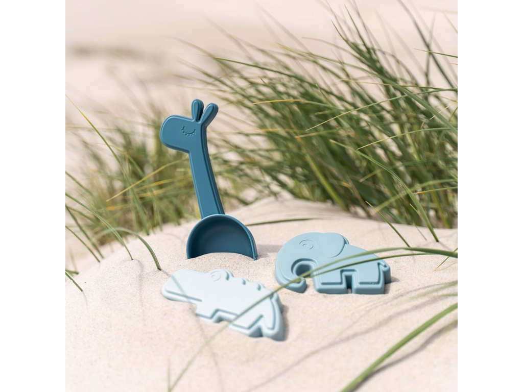 Modrá sada tří plastových hraček na pláž nebo na pískoviště zabaví každého raubíře. Krokodýl, sloník i žirafa budou skvělými kamarády na zahradu i k moři. Lopatka a formičky jsou krásným dárkem a potěší každého.