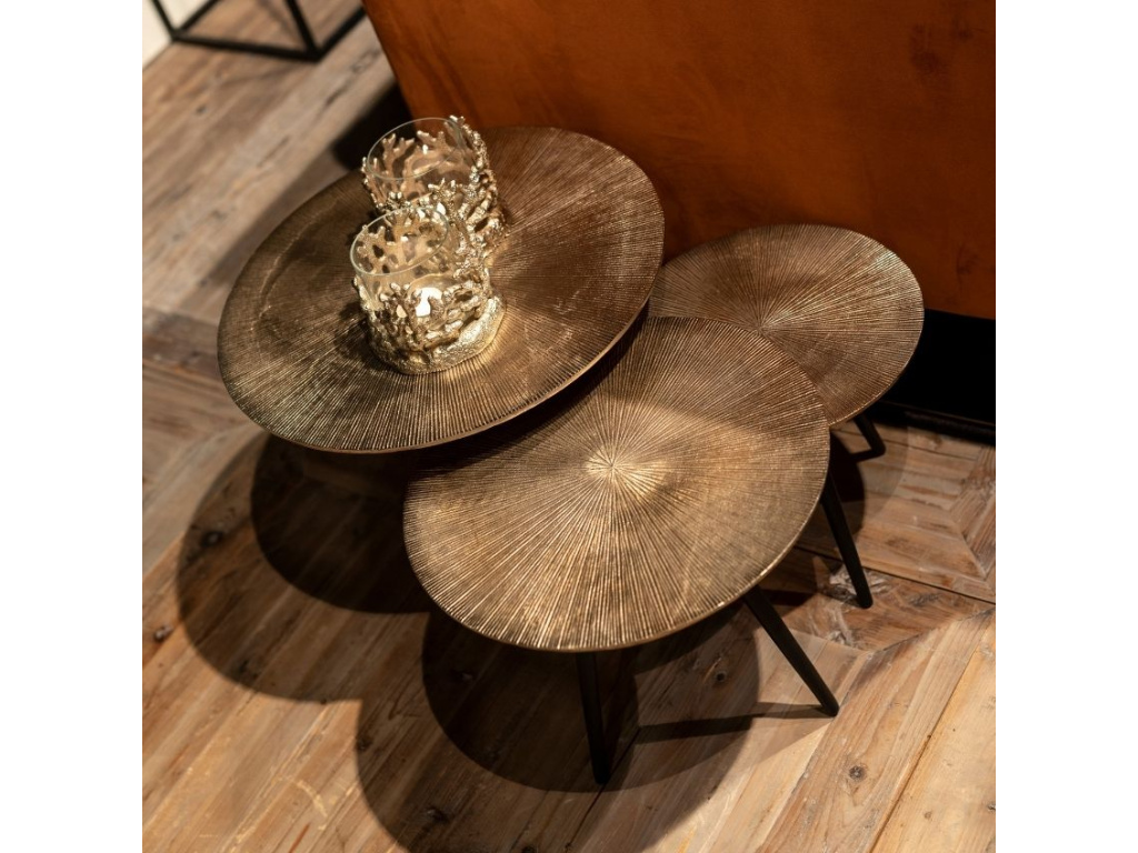Vittorio značky Richmond je set kovových stolků, ve kterém najdete tři odkládací stolky různých velikostí. Stolky zaujmou především svými jemně strukturovanými deskami. Zlatá barva desek je doplněna černě zbarvenými podnožemi. Stolky jsou vyrobeny z odolného lakovaného hliníku a mohou sloužit například k naaranžování květin nebo svícnů a jiných dekorací. Do interiéru s sebou přinesou nádech elegance a luxusu.
