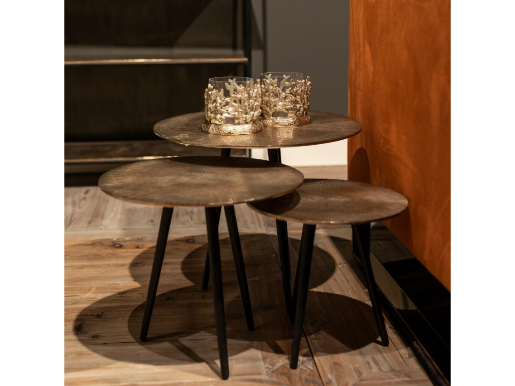 Vittorio značky Richmond je set kovových stolků, ve kterém najdete tři odkládací stolky různých velikostí. Stolky zaujmou především svými jemně strukturovanými deskami. Zlatá barva desek je doplněna černě zbarvenými podnožemi. Stolky jsou vyrobeny z odolného lakovaného hliníku a mohou sloužit například k naaranžování květin nebo svícnů a jiných dekorací. Do interiéru s sebou přinesou nádech elegance a luxusu.