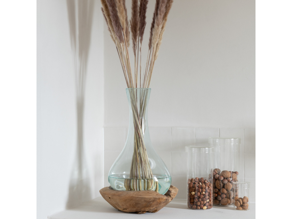 Skleněná váza Gebra od značky J-line v čirém provedení s dřevěnou podstavou bude perfektní pro živé rostliny nebo dekorační trávy, větvičky i peříčka. Její tvar připomíná kapku vody a díky tomu bude v interiéru vypadat skvěle i prázdná, jako pouhá dekorace. Lze ji dokonce využít i jako karafu na vodu. V nabídce máme i její větší variantu – kterou si vyberete?