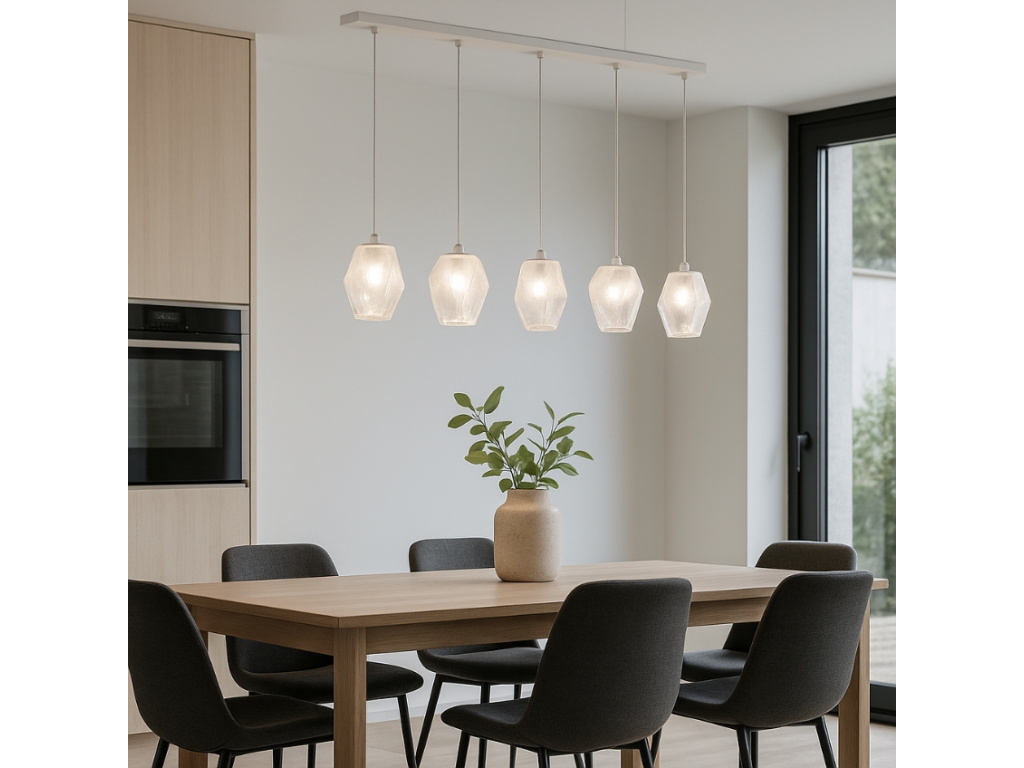 Dodejte vaší domácnosti unikátní vzhled s originálními závěsnými světly Ice od Nova Luce, které svým vzhledem připomínají chladivé kusy ledu. Neobvyklý tvar stínidla vytváří kouzelnou hru s odlesky a stíny, které podtrhuje nádherný přechod z ledově bílé do transparentní barvy. Celý kousek elegantně doplňují bílé kovové prvky a zavěšení. Světlo se bude v moderním interiéru vyjímat jako jedinečný klenot. Umístěte jej například do středu místnosti a kombinujte světla Ice mezi sebou!