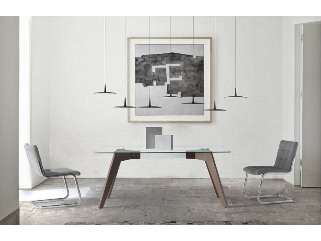 Angel Cerdá přináší jídelní stůl jednoduchého čistého designu. Jeho transparentní deska z tvrzeného skla naplní váš interiér svěžím vzdušným dojmem. Kontrastem k ní je masivní pevná podnož z ořechové dýhy, která oproti desce celému vzhledu dodává pocit uzemnění a stability. Zkombinujte tento stůl s dalším nábytkem se skleněnými prvky a dejte tak světlo vaší moderní jídelně nebo kuchyni.