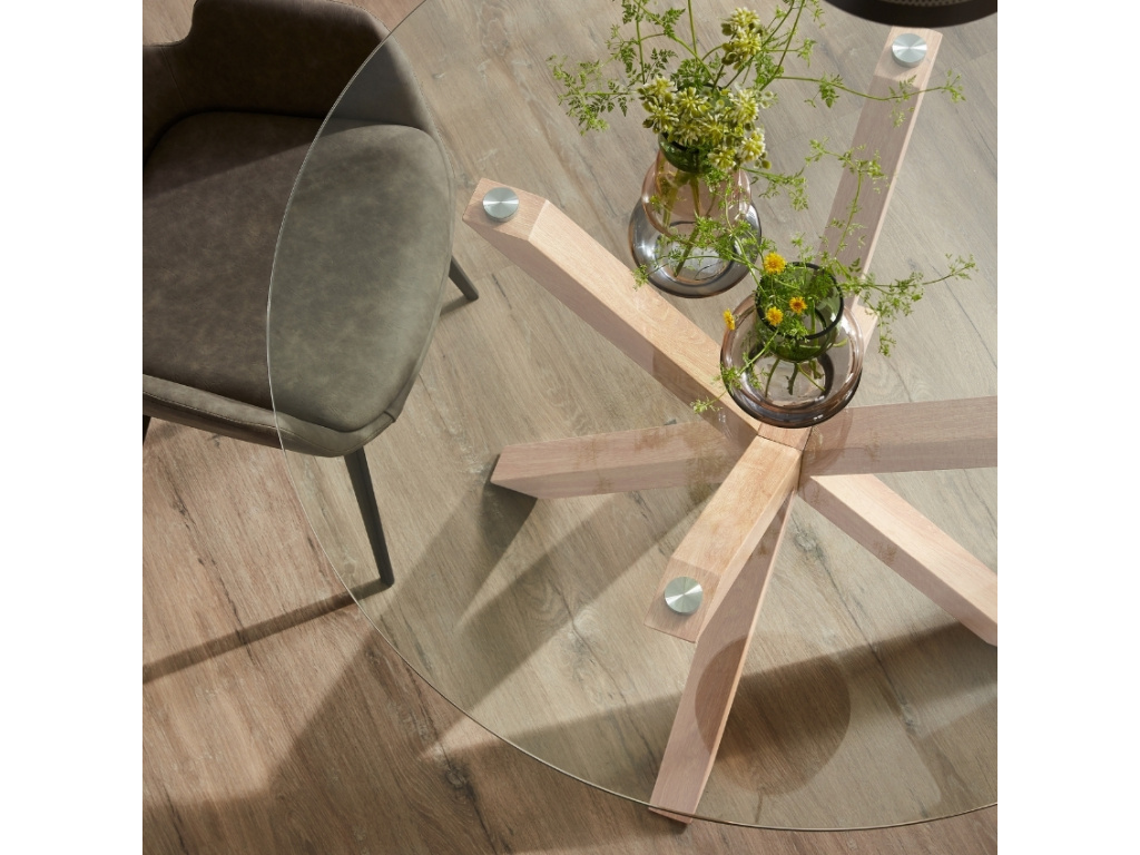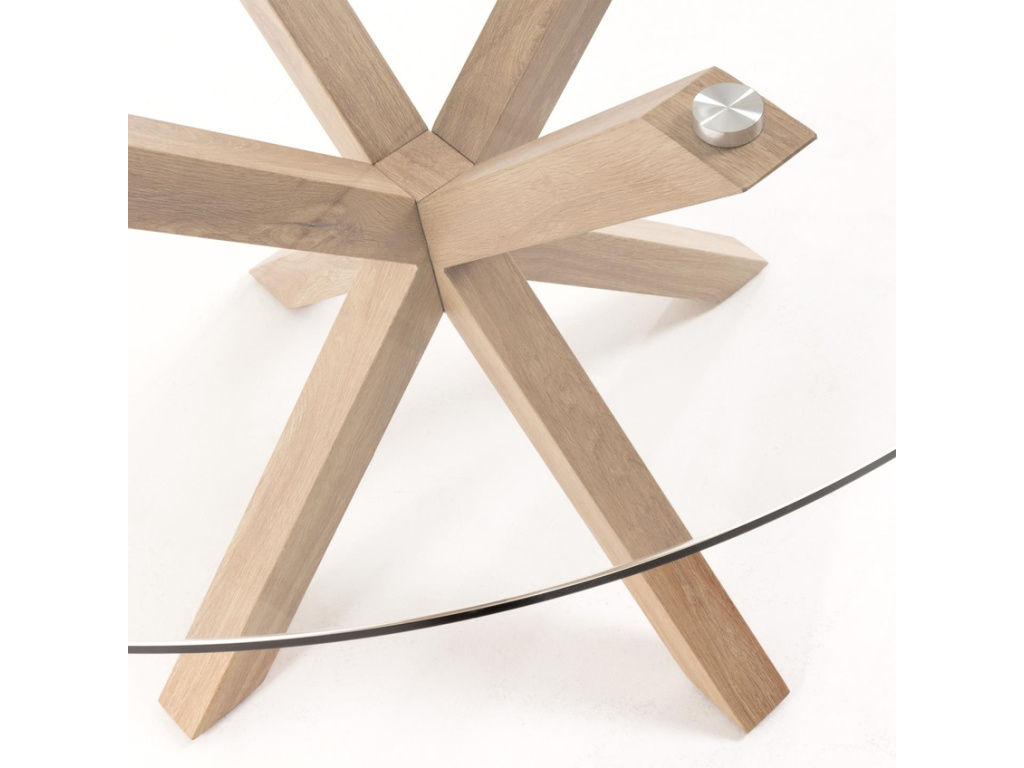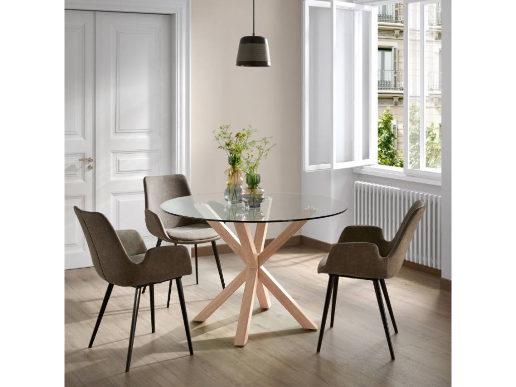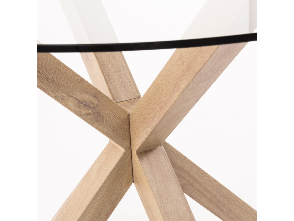 Krásný a nadčasový kulatý jídelní stůl Kave Home Argo vás na první pohled zaujme svým originálním a propracovaným designem. Jeho podnož je vyrobena z oceli v dekoru přírodního dřeva a má zajímavý tvar připomínající hvězdu. Zajišťuje perfektní stabilitu a navíc každého na první pohled zaujme. Desku tvoří tvrzené transparentní sklo a skvěle se s podnoží doplňuje. Tento jídelní stůl se bude vyjímat zejména v moderních interiérech.