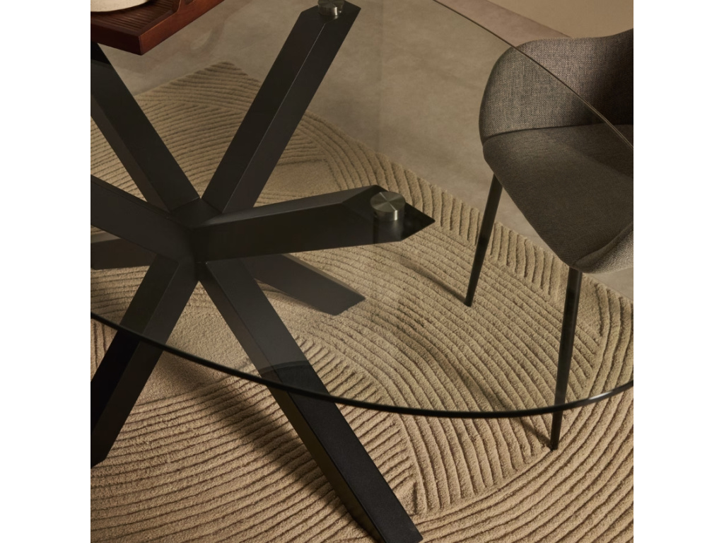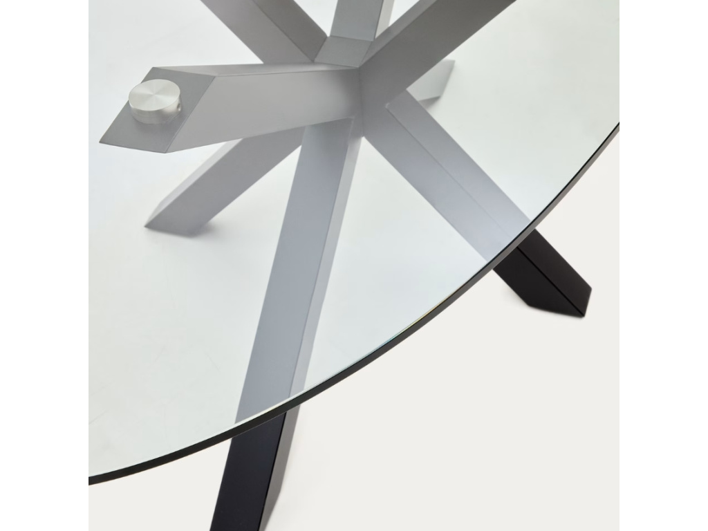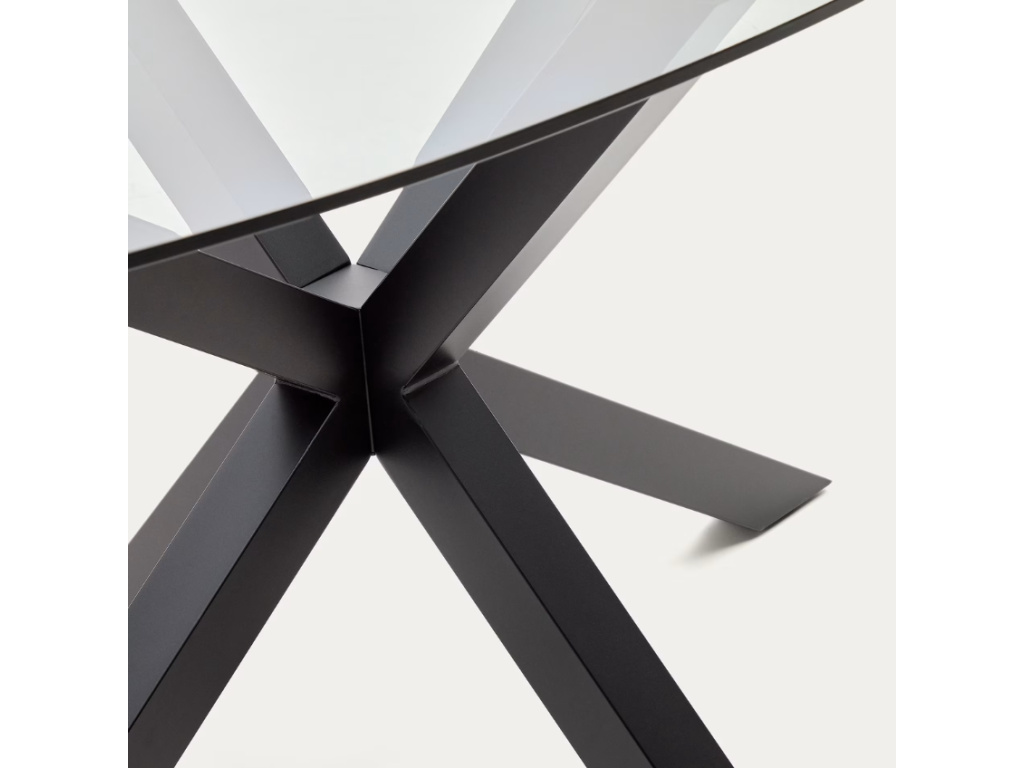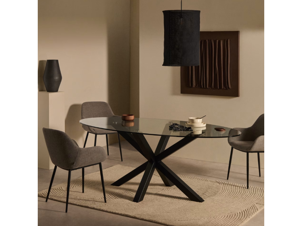 Krásný a nadčasový oválný jídelní stůl Kave Home Argo vás na první pohled zaujme svým originálním a propracovaným designem. Podnož zajišťující perfektní stabilitu je vyrobena z černě lakované oceli a má zajímavý tvar připomínající hvězdu. Desku tvoří transparentní tvrzené sklo. Tento jídelní stůl je díky svým rozměrům skvělou volbou zejména pro početnější rodiny.
