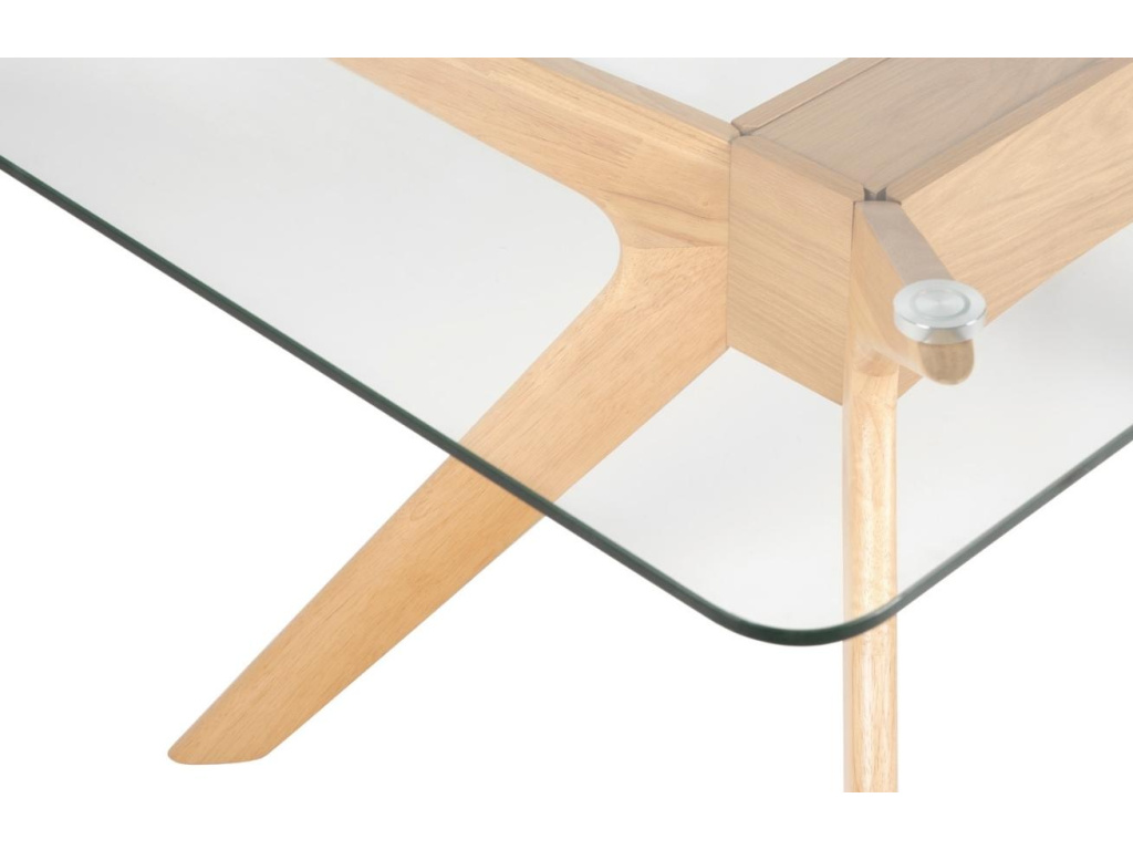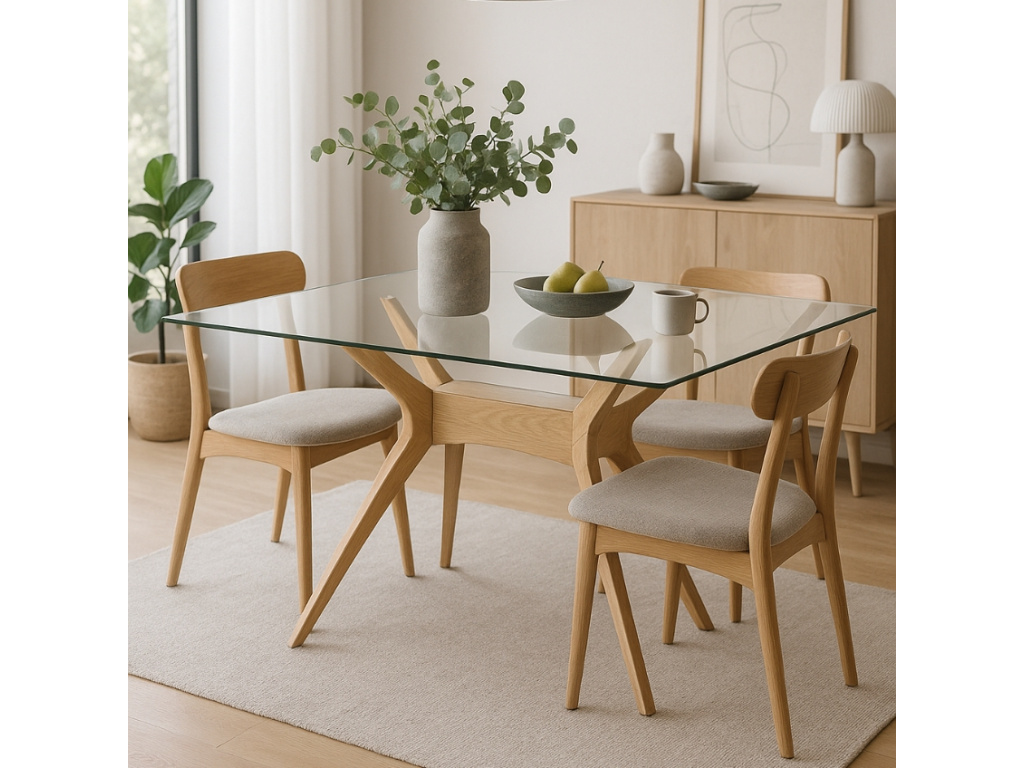Designový jídelní stůl Somcasa Della má skleněnou horní desku z tvrzeného skla. Sklo o tloušťce 1 cm je odolné proti poškrábání a chemickým prostředkům. Podnož má povrchovou úpravu dubovou dýhou, která dotváří elegantní a originální kombinaci pro každý typ interiéru.