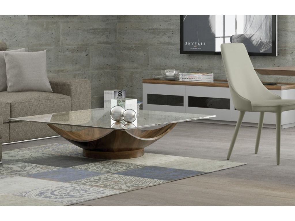Designový konferenční stolek Miotto Eliseo opravdu zaujme na první pohled, a to zejména díky propojení transparentní skleněné desky a originálně řešené podnože z ořechové dýhy přírodního vzhledu. Atraktivní spojení dřeva a skla podtrhuje jedinečnost tohoto stolku, který dodá vašemu obývacímu pokoji moderní a osobitý styl. Konferenční stolek Eliseo se tak stane výrazným a nepřehlédnutelným prvkem každého interiéru.