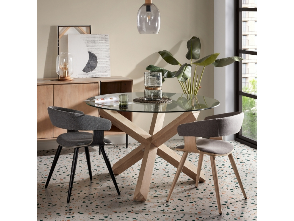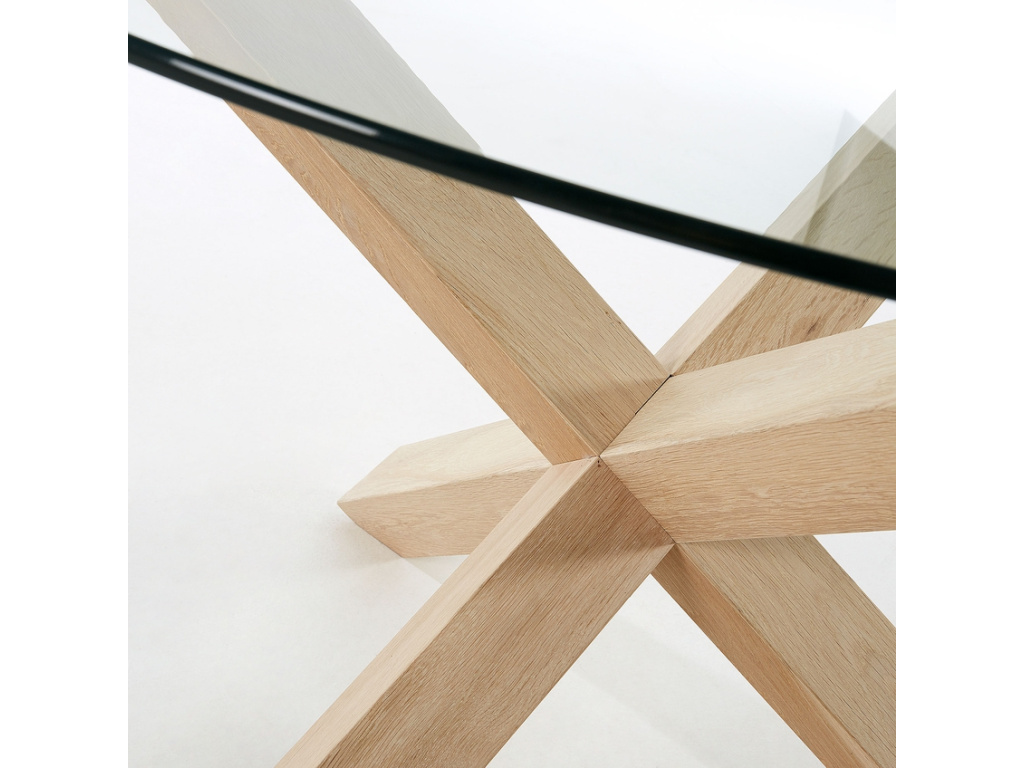 Moderní skleněný jídelní stůl Kave Home Lotus s dubovou podnoží zaujme svou jedinečnou materiálovou kombinací. Jídelnu nebo obývací pokoj se díky němu promění v útulné místo, ze kterého nebudete chtít dobrovolně odejít. Podnož je řešena jedinečným kříženým způsobem, jenž produkt dostane o stupeň výš. Pořiďte si tento originální kus designového nábytku, který ozvláštní i vaši domácnost.