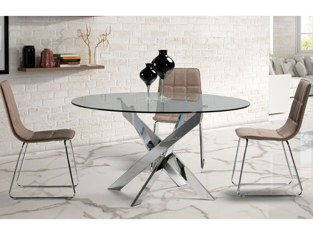 Moderní jídelní stůl Ruth značky Marckeric zaujme svým nadčasovým designem a použitými materiály. Podnož je vytvořená ze zkřížených kovových tyčí, které podpírají skleněnou desku stolu. Ruth snadno doladí každou kuchyň či jídelnu a dodá danému prostoru eleganci a styl.