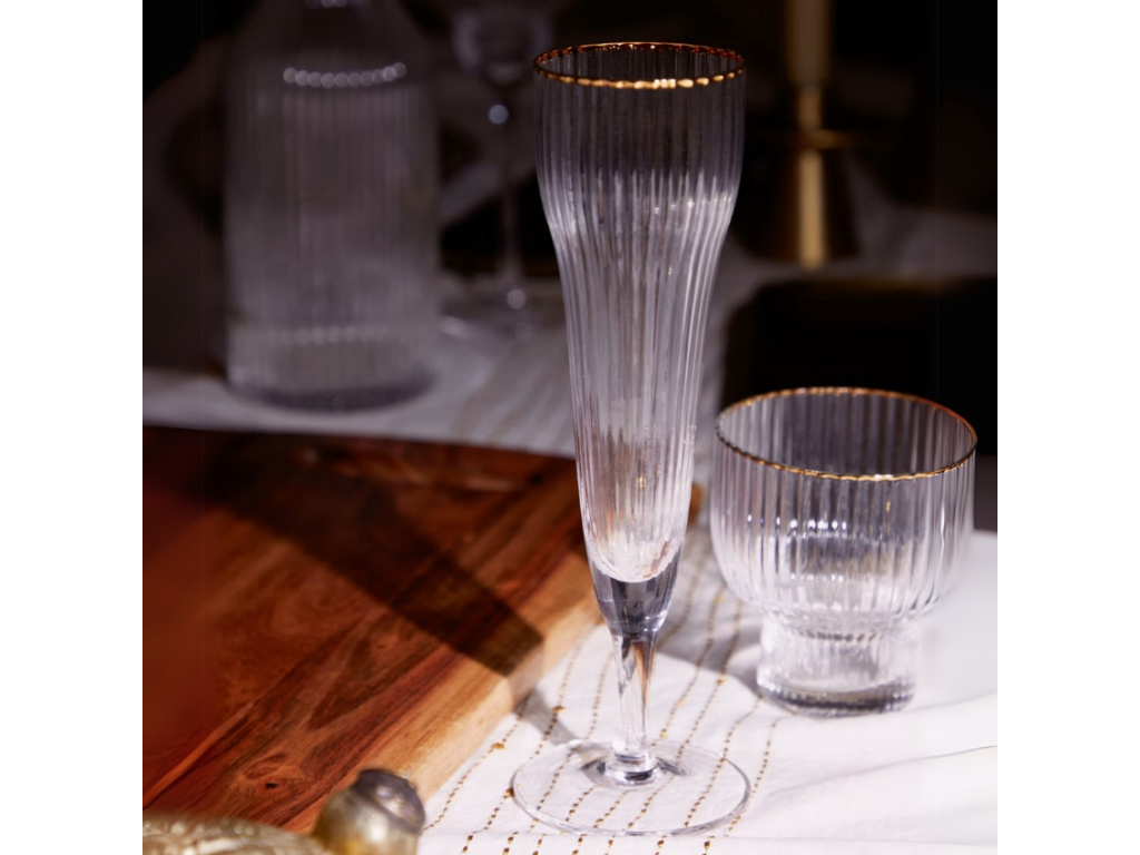 Kolekce nádobí Kave Home Ayan zaujme svým nápaditým vzhledem, který kombinuje průzračné sklo s elegantním zlatým okrajem a jemným vertikálním rýhováním. V kolekci lze samostatně zakoupit sklenice, karafy, sklenice na víno, šampaňské i míchané koktejly. Nejenže toto nádobí promění běžné stolování ve výjimečnou událost, ale je i praktické – bez obav ho můžete mýt v myčce na nádobí.