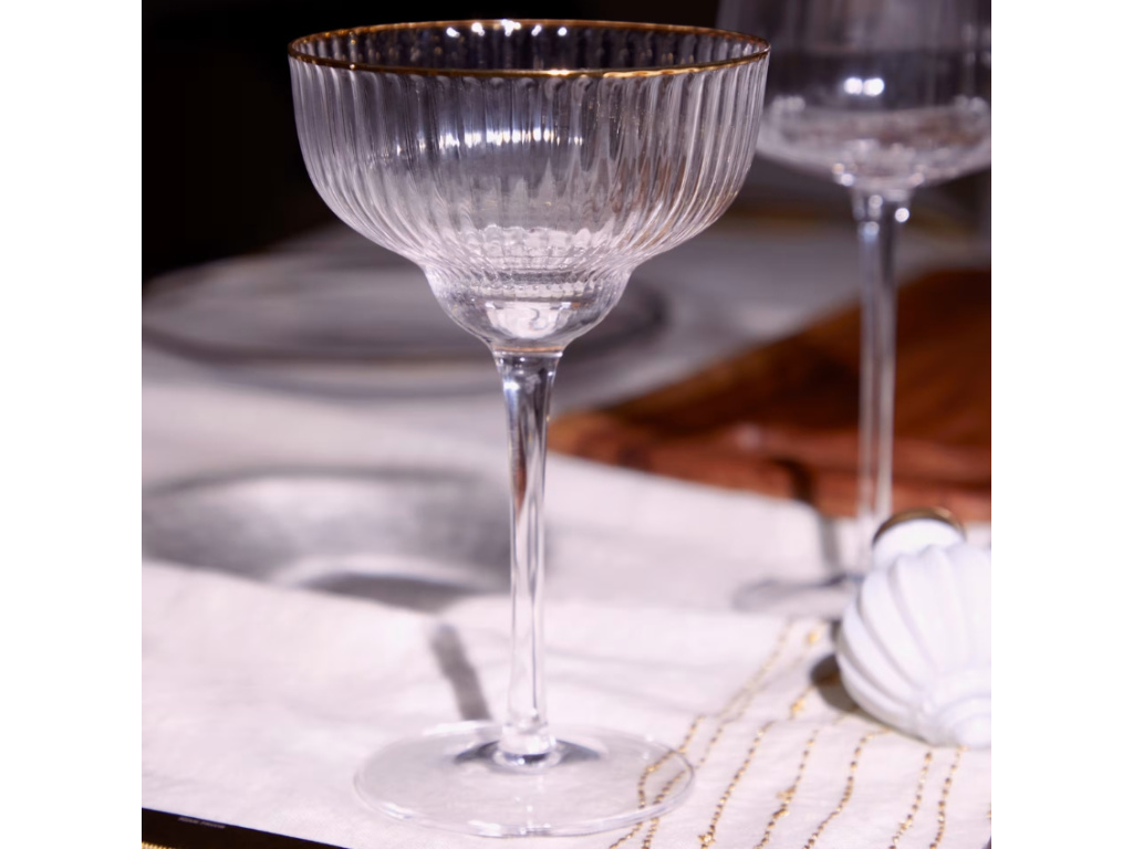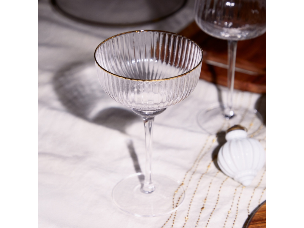 Kolekce nádobí Kave Home Ayan zaujme svým nápaditým vzhledem, který kombinuje průzračné sklo s elegantním zlatým okrajem a jemným vertikálním rýhováním. V kolekci lze samostatně zakoupit sklenice, karafy, sklenice na víno, šampaňské i míchané koktejly. Nejenže toto nádobí promění běžné stolování ve výjimečnou událost, ale je i praktické – bez obav ho můžete mýt v myčce na nádobí.