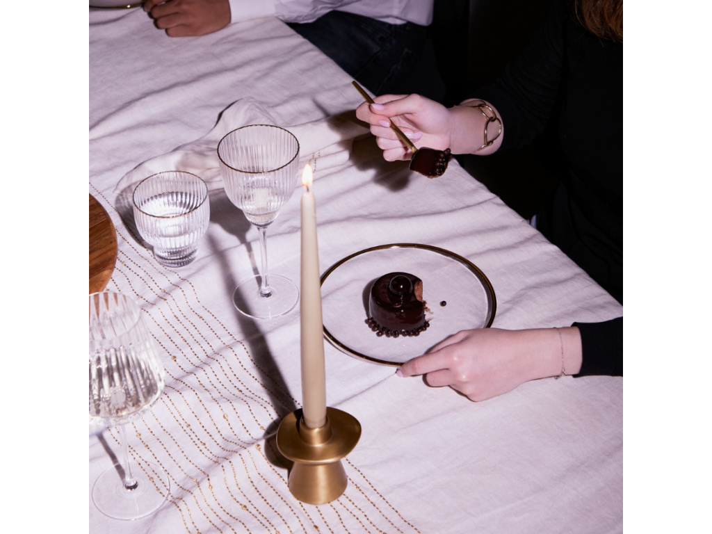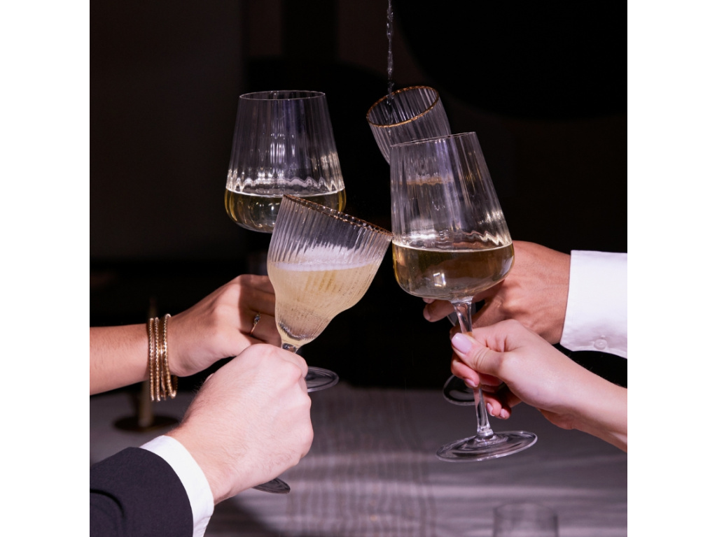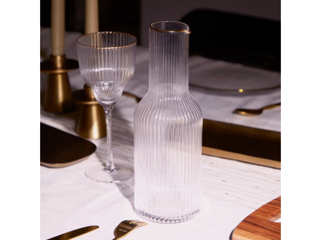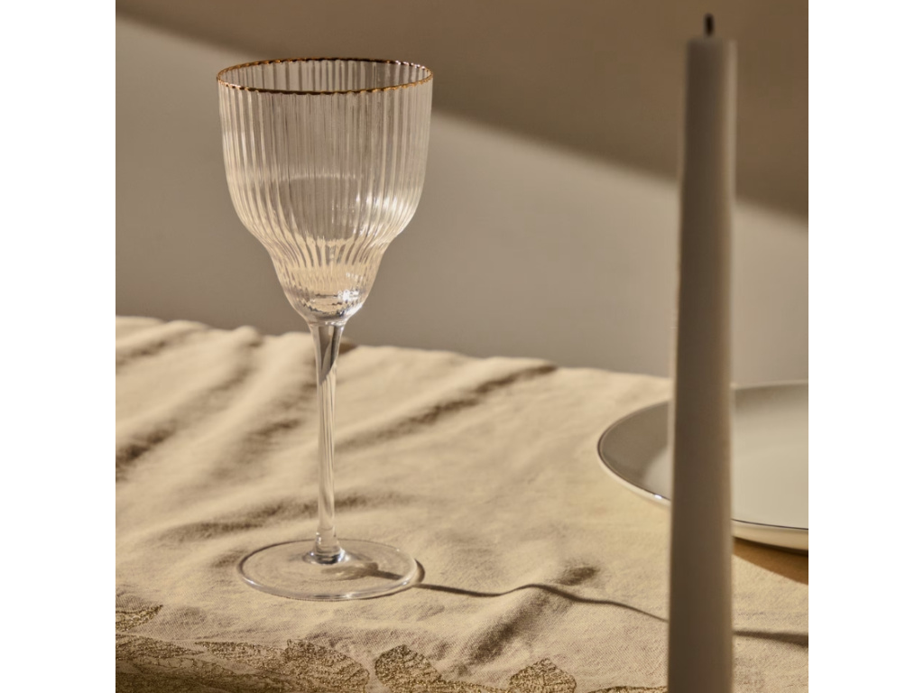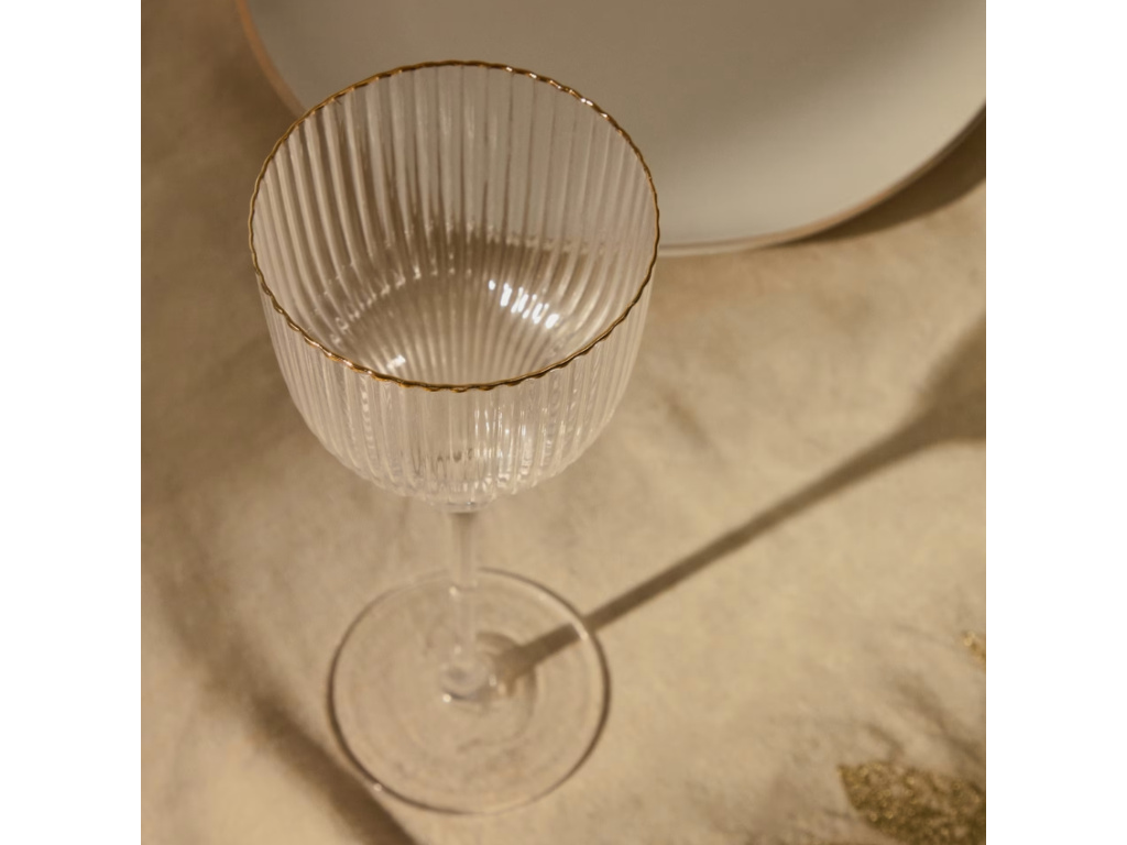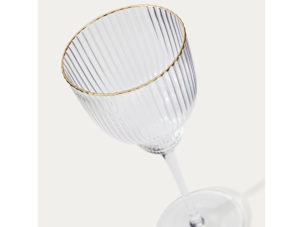 Kolekce nádobí Kave Home Ayan zaujme svým nápaditým vzhledem, který kombinuje průzračné sklo s elegantním zlatým okrajem a jemným vertikálním rýhováním. V kolekci lze samostatně zakoupit sklenice, karafy, sklenice na víno, šampaňské i míchané koktejly. Nejenže toto nádobí promění běžné stolování ve výjimečnou událost, ale je i praktické – bez obav ho můžete mýt v myčce na nádobí.