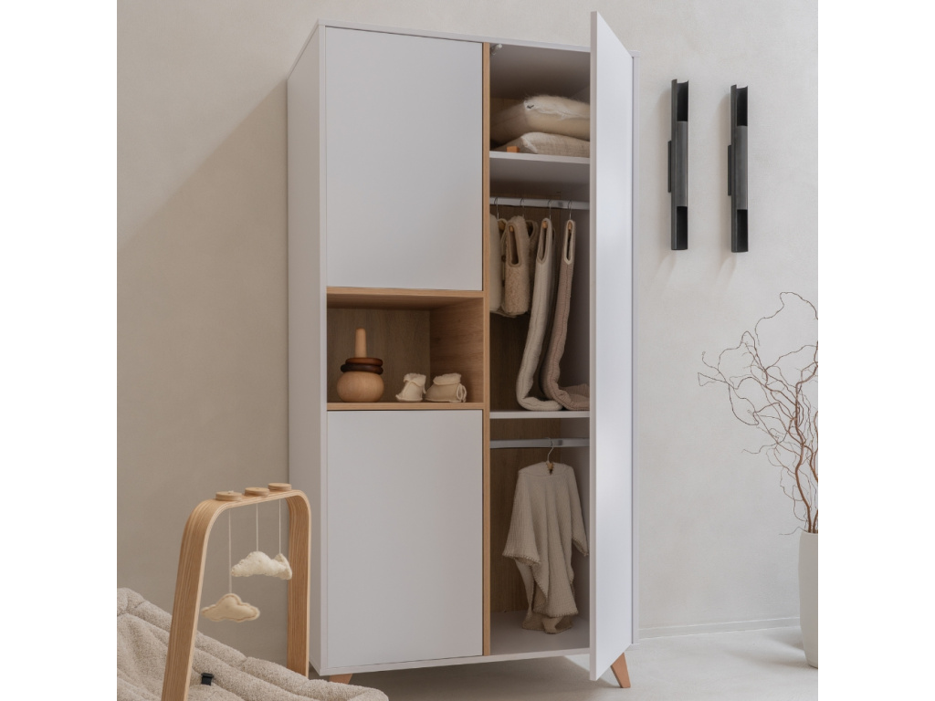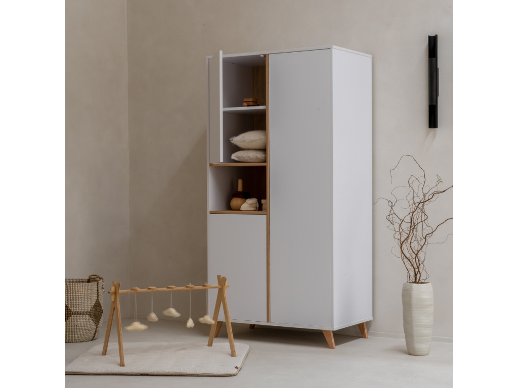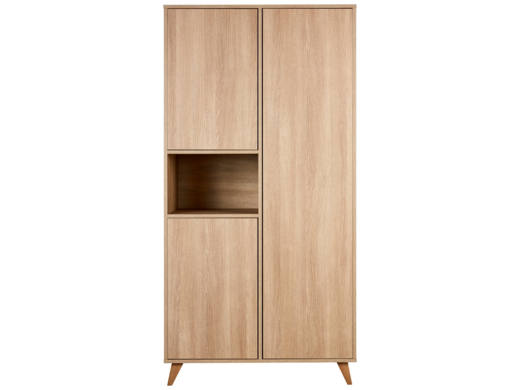 Skříň Quax Loft zaujme čistými liniemi a dřevěným dekorem v krásném přírodním tónu, který vnese do interiéru teplo a nadčasovou eleganci. Tři bezúchytkové dvířka ukrývají promyšlený vnitřní prostor se čtyřmi policemi a 2 šatními tyčemi, ideální pro přehledné uložení dětského oblečení i doplňků. Stabilitu a designovou lehkost jí dodává podnož z masivního bukového dřeva. Doporučujeme ji kombinovat s dalšími kousky z řady Quax Loft pro harmonicky sladěný domov.