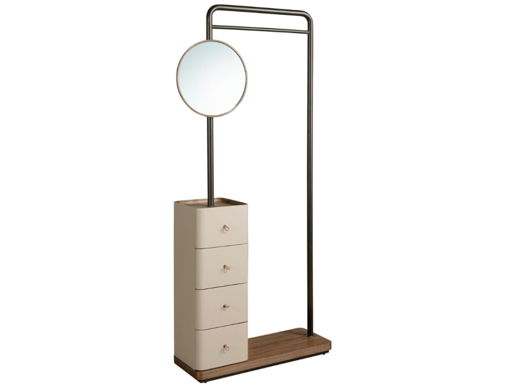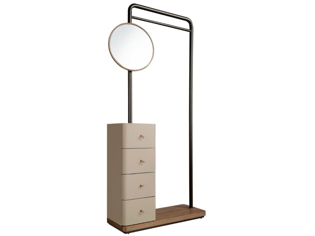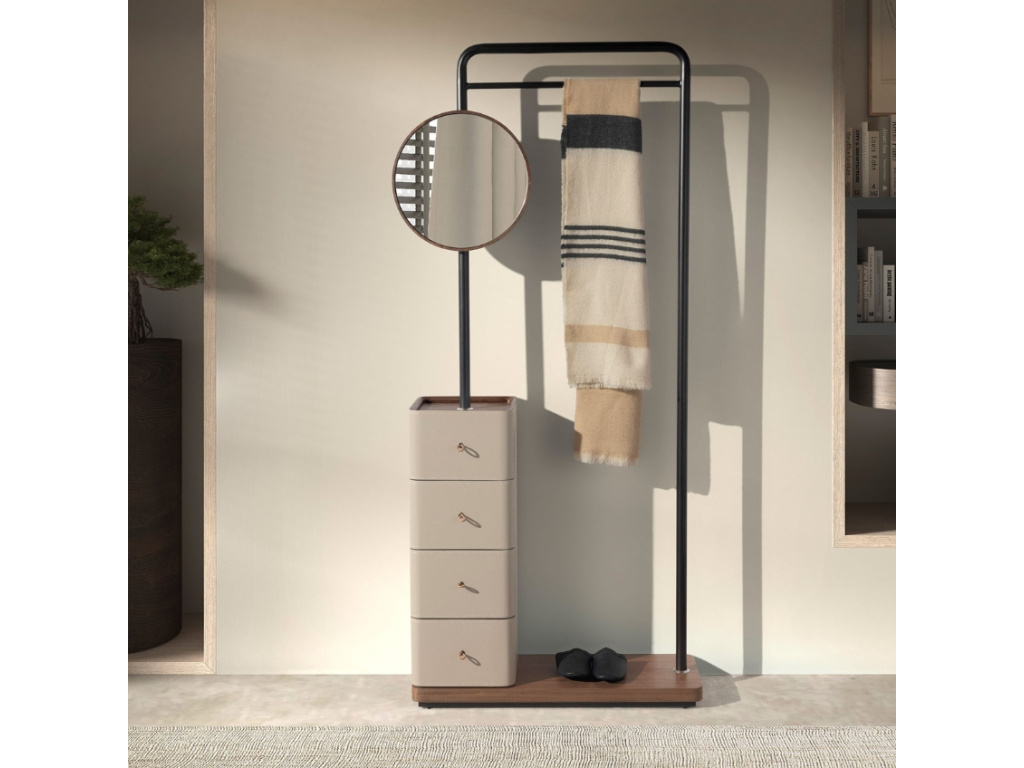 Vdechněte své předsíni, ložnici nebo šatně moderní eleganci s praktivkým stojacím věšákem od španělské značky Angel Cerdá. Tento výrazný kousek kombinuje černou ocel s přírodní ořechovou dýhu s noblesním čalouněním z hovězí kůže v jemném norkovém odstínu. Jeho součástí je kromě kulatého zrcadla také čtveřice zásuvek s koženými poutky a tichým dovíráním. Každý detail působí precizně, promyšleně a mimořádně harmonicky – od barevného ladění až po kontrast materiálů. Doplnit ho můžete dalšími kousky ve stejném designu – nočním stolkem, komodami i dalším věšákem s úložným prostorem.
