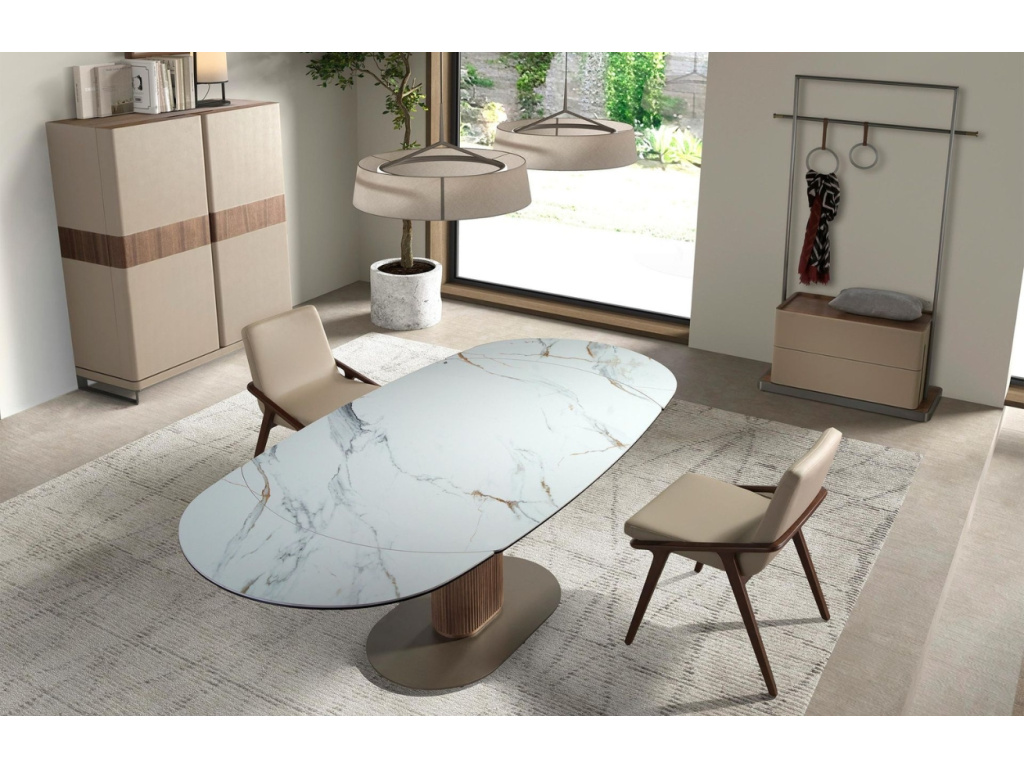 Vdechněte své předsíni, ložnici nebo šatně moderní eleganci s praktivkým stojacím věšákem od španělské značky Angel Cerdá. Tento výrazný kousek kombinuje nerezovou ocel s přírodní ořechovou dýhu s noblesním čalouněním z hovězí kůže v jemném norkovém odstínu. Jeho součástí jsou kromě 2 zásuvek také 2 závěsné kruhy, které využijete třeba na pásky, šátky nebo kravaty. Každý detail působí precizně, promyšleně a mimořádně harmonicky – od barevného ladění až po kontrast materiálů. Doplnit ho můžete dalšími kousky ve stejném designu – nočním stolkem, komodami i dalším věšákem s úložným prostorem.