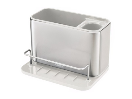 Praktický nerezový stojan Surface Sink Tidy od Joseph Joseph je určený na kuchyňské mycí prostředky a pomůcky. Najdete v něm oddělené sekce pro saponát a kartáč. Vnější držák slouží pro sušení mokrých houbiček a drátěnek. Základna disponuje miskou a odtokem pro snadné vylití vody. Stojan je rozebíratelný pro snadné čistění. Disponuje protiskluzovými nožičkami a matným nerezovým povrchem, odolným proti otiskům prstů.
