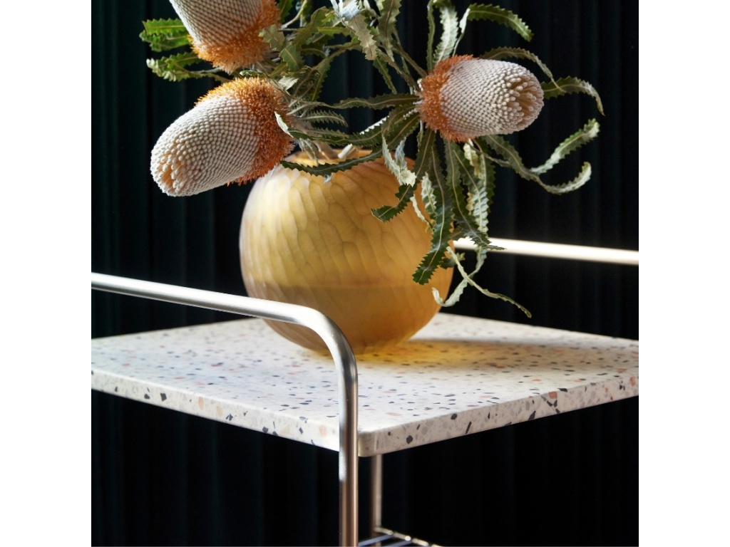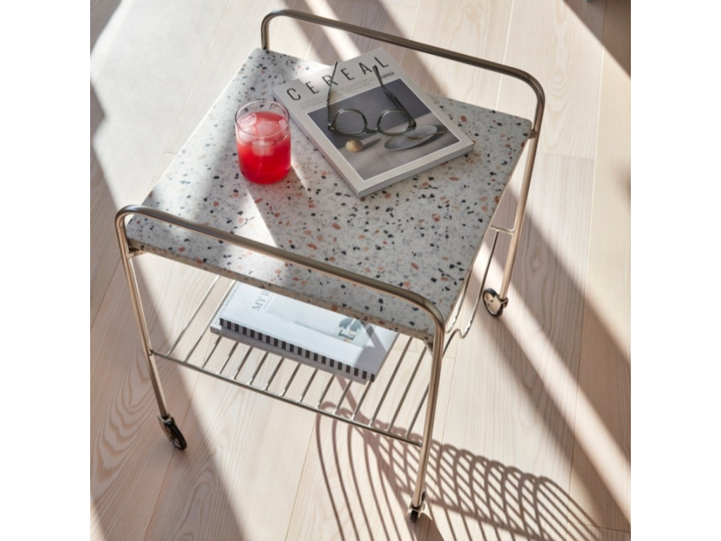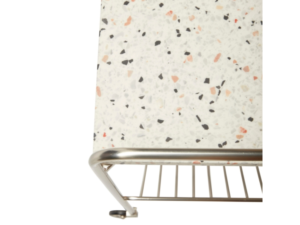 Poutavý servírovací vozík Hübsch Wave se stane perfektním pomocníkem, který využijete především během slavnostních událostí. Konstrukci tvoří pevné, stříbrně lakované kovové tyče. Dolní patro zdobí zvlněný prostor, který odlehčuje celkový design a dodává mu příjemný kontrast. K servírování nápojů pak poslouží překrásná deska z terrazza. Stolek lze snadno přemisťovat díky praktickým kolečkům s gumovým povrchem, jež zabrání případnému poškrábání podlahy.