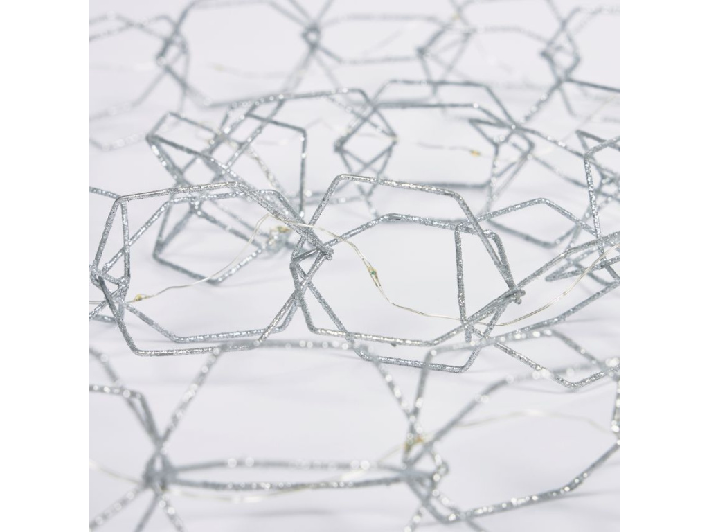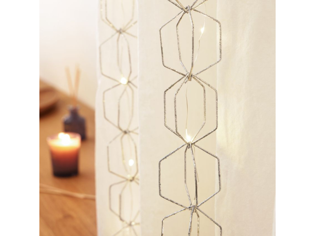 Světelný LED řetěz Narel značky Kave Home se skvěle hodí k ozdobení vánočního stromečku. Využití ale najde během celého roku - můžete ho použít třeba k osvětlení TV stolku. Řetěz je tvořen množstvím stříbrných kovových šestihranů a k jeho rozsvícení vám postačí dvě tužkové baterie. Právě díky bateriím jej můžete umístit kamkoliv - nemusíte se ohlížet na přítomnost zásuvky.