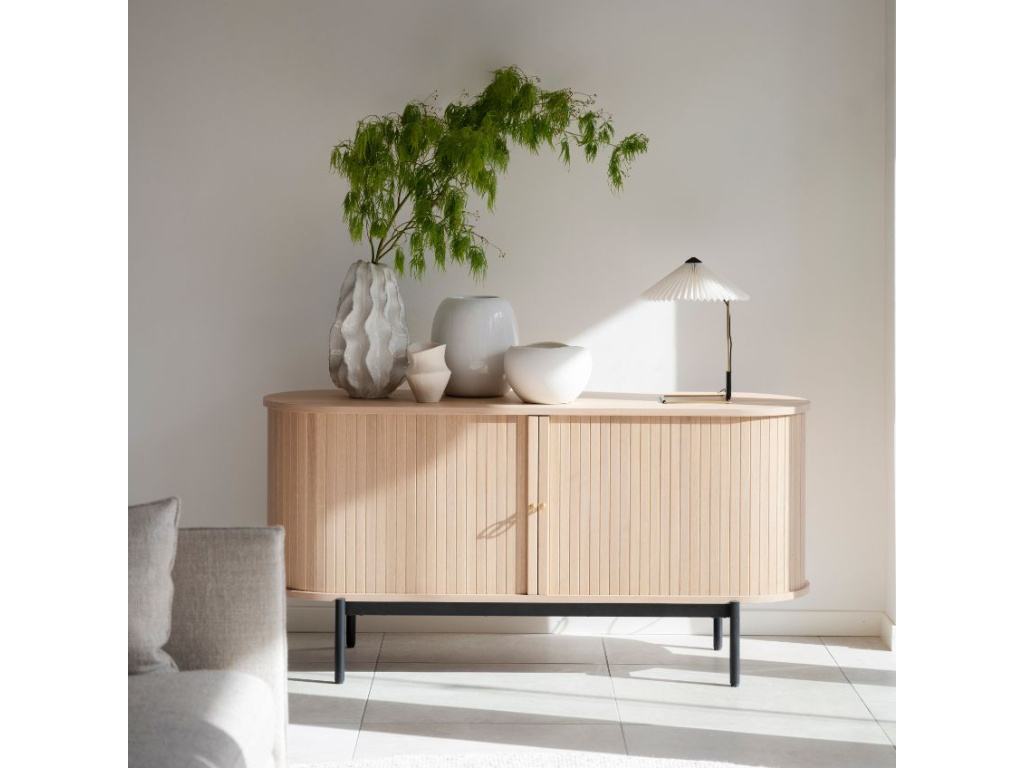 Komoda HADDINGTON značky ROWICO je vyrobena z dubové dýhy, jejíž atraktivní světlé zbarvení je velice moderní a dodá interiéru lehkost a vzdušnost. Vzdušný vzhled komodě dodává také vyšší kovová podnož, která připomíná podstavec - komoda bude tedy výraznou dominantou každého prostoru. Slušet jí to bude v rustikálních interiérech i v interiérech laděných ve stylu scandi. Úložný prostor komody je rozdělen do čtyř polic, které jsou ukryty za dvěma posuvnými dvířky. Komoda může sloužit například k uskladnění ručníků nebo ložního prádla. A pokud vám třeba zrovna došlo místo v knihovně, do komody HADDINGTON se jich dost vejde!