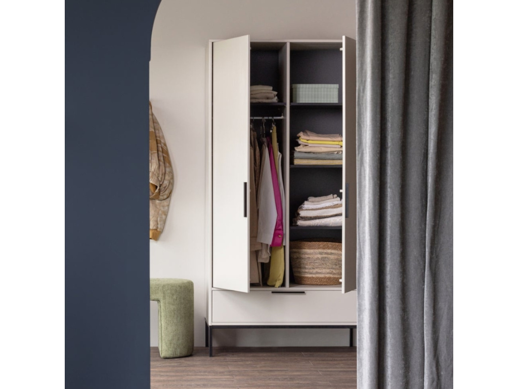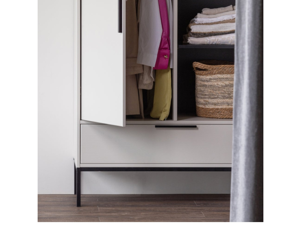 Šatní skříň Mutas představuje nadčasový designový kousek, který skvěle doplní každou moderní ložnici v duchu skandinávského stylu. Ale hlavně jde o praktický úložný prostor s policemi, zásuvkou i tyčí k zavěšení košilí, šatů i kabátů. Mutas je vyrobena je z borovicového dřeva s certifikací FSC a následně lakována světle béžovou barvou. Černě lakovaná kovová podnož podtrhává celkový design skříně. Nechte se okouzlit jednoduchým a funkčním designem s promyšlenými detaily! Kolekce Mutas zahrnuje také další varianty skříní v různých barevných provedeních, které splní vaše estetické i funkční požadavky.