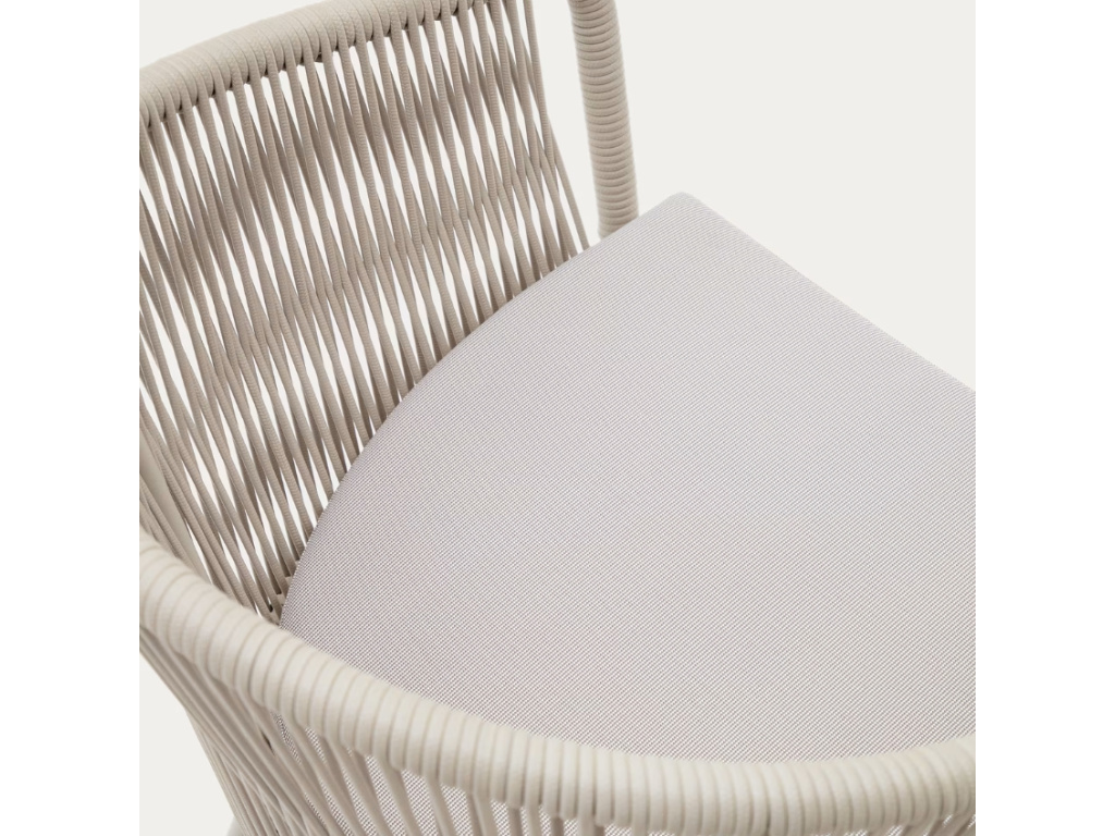 Jednoduchá jídelní židle Kave Home Yanet jednoznačně zaujme svým hustě proplétaným opěradlem ze syntetického lana, odolného vůči UV záření. Tento jedinečný design zajišťuje opěradlo z polyesterových provázků a měkký odnímatelný sedák. Pozinkovaná ocelová konstrukce s podnoží je odolná vůči rzi a korozi, a díky tomu se Yanet hodí do venkovních i vnitřních prostor. Doplňte své zahradní posezení o tento elegantní kousek!