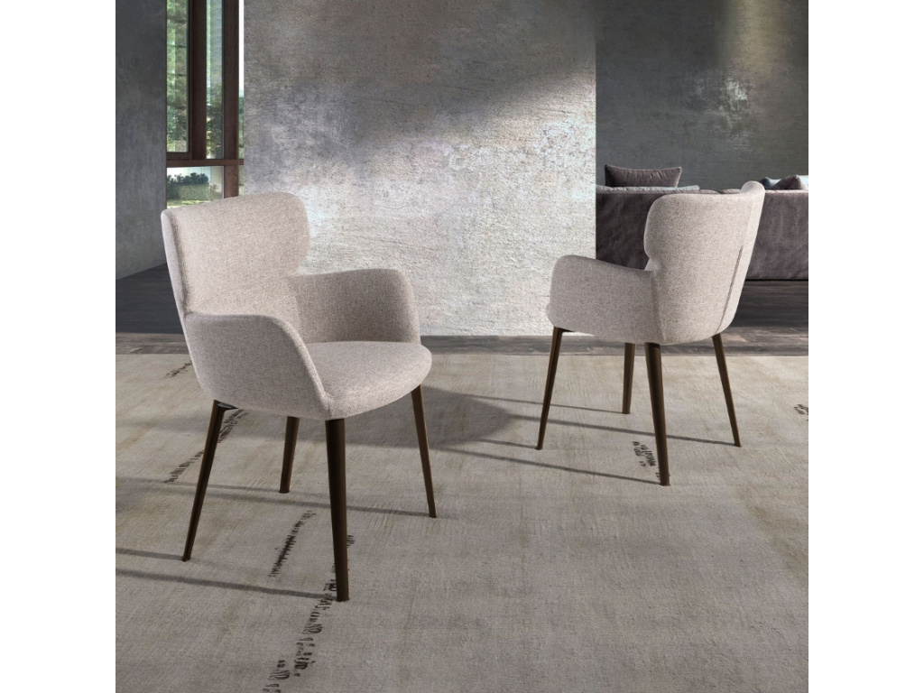 Jídelní židle s područkami, která spojuje pohodlí a moderní design. Látkové čalounění v melírované světle hnědé barvě působí útulně a přirozeně. Měkce polstrovaný sedák a ergonomicky tvarované opěradlo zajistí příjemné sezení. Kovová podnož v tmavě hnědém provedení přidává židli vizuální lehkost a stabilitu. Perfektní volba pro jídelny v přírodním nebo rustikálním stylu.