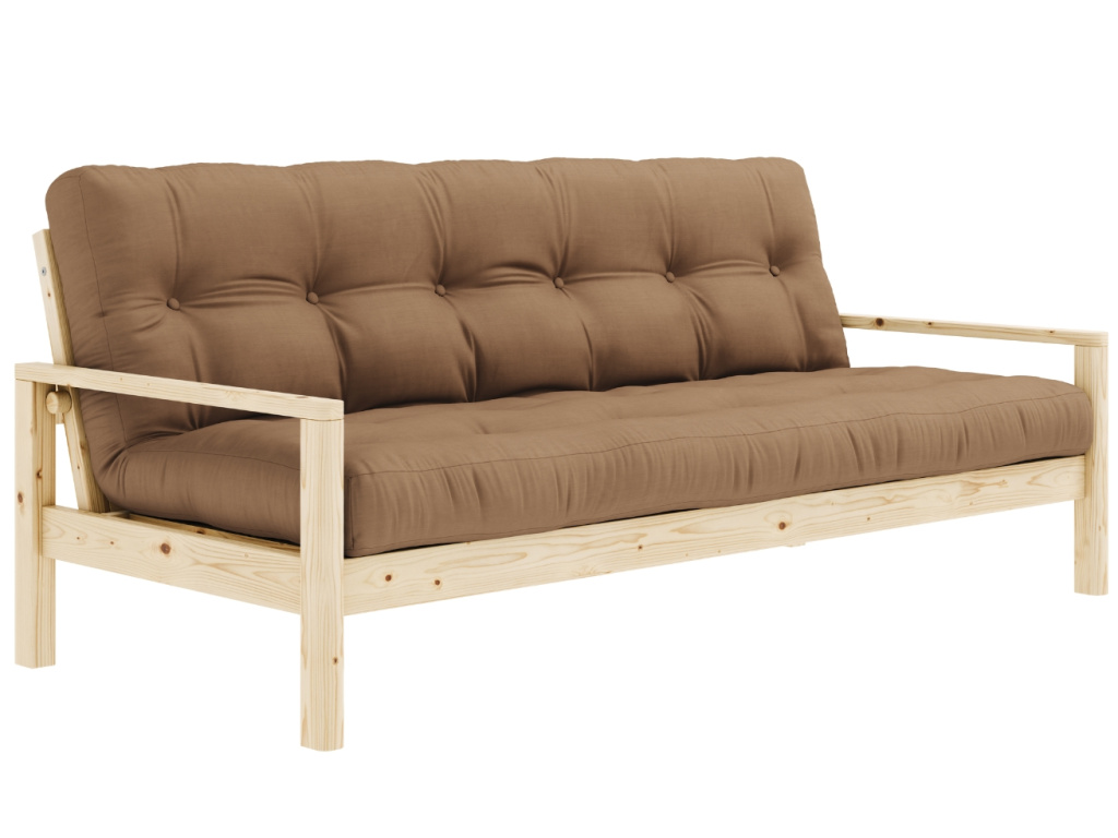 Pohovka nebo postel? Trojmístná rozkládací pohovka Knob od dánské značky Karup Design umí být obojím! Pod dřevěnými područkami se nachází dva nenápadné úchyty, které lze snadno odšroubovat a vy tak během chvilky získáte pohodlné lůžko pro vás nebo vaše hosty. Konstrukce z masivního borovicového dřeva s FSC certifikací je doplněna kvalitní 14cm futonovou matraci, která v sobě kombinuje recyklovaná vlákna a 4 cm pěny. Pohovka Knob fantasticky zapadne do skandinávských a japonských stylů interiérů, do kterých vnese jednoduchost, eleganci a ryzí funkčnost. Představuje skvělé řešení zejména pro menší prostory, do kterých přinese další místo na spaní. Vybrat si ji můžete v další barvě konstrukce či v mnoha barvách matrací.