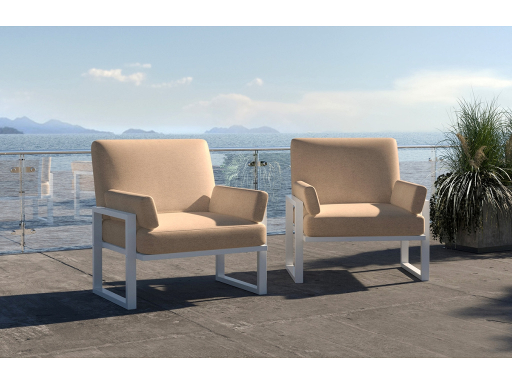 Zažijte nepřekonatelný komfort díky zahradnímu křeslu MESONICA Soledo z prémiového materiálu. Křeslo ve světle hnědé barvě se pyšní pohodlným, vodoodpudivým sedákem, který si zachovává stálobarevnost. V kombinaci s kovovou, lakovanou podnoží odolnou proti korozi působí moderním a svěžím dojmem. Další výhodou čalouněného křesla je, že se může pochlubit dlouhou životností, dá se snadno čistit, je ohnivzdorné a je dodáváno se dvěma dekorativními polštáři. Zkombinujte křeslo i s dalšími produkty řady Soledo, která je dostupná s bílou nebo antracitovou podnoží a nabízí výběr čalounění z široké palety barev.
