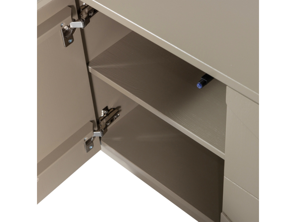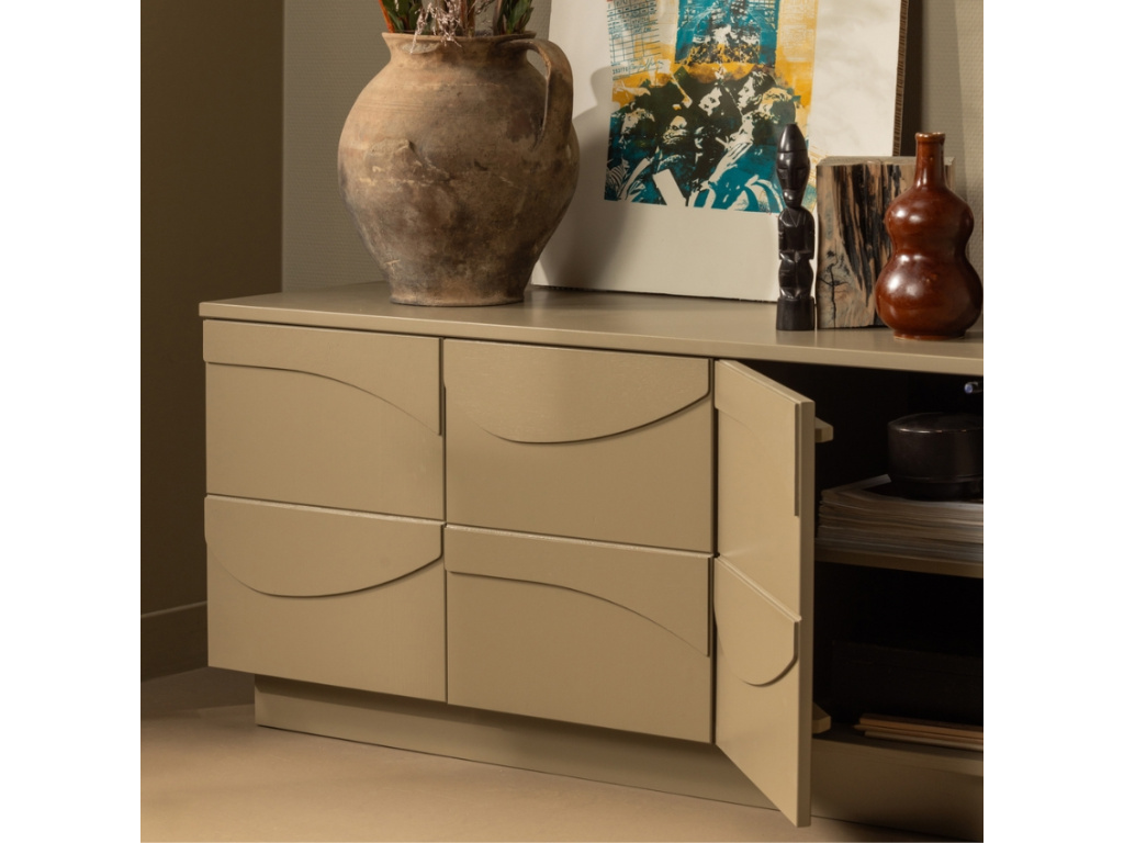 TV stolek Dorick od značky Hoorns se stane vaším oblíbeným kouskem nábytku. Je minimalistický, moderní a se svým zemitým tónem snadno zapadne do většiny interiérů. Korpus je z borovicového dřeva s certifikací FSC, takže máte jistotu, že pochází z odpovědných zdrojů. Dvířka na první pohled zaujmou svým lehce vystouplým reliéfem s organickými tvary, které vytváří stín a TV stolek tak působí více plasticky. Uvnitř se ukrývá policový úložný prostor, který je rozdělen na tři části – 2x krajní se šířkou 69 cm a 1x prostřední s 34 cm, který navíc má na zadní desce otvor pro kabely. Dvířka jsou vybavena tichým systémem push to open, takže na ně stačí zatlačit a v tichosti se otevřou. Televizní stolek se bude skvěle vyjímat např. ve skandinávských a minimalistických interiérech. Sladit ho můžete s dalšími produkty z této série Dorick.