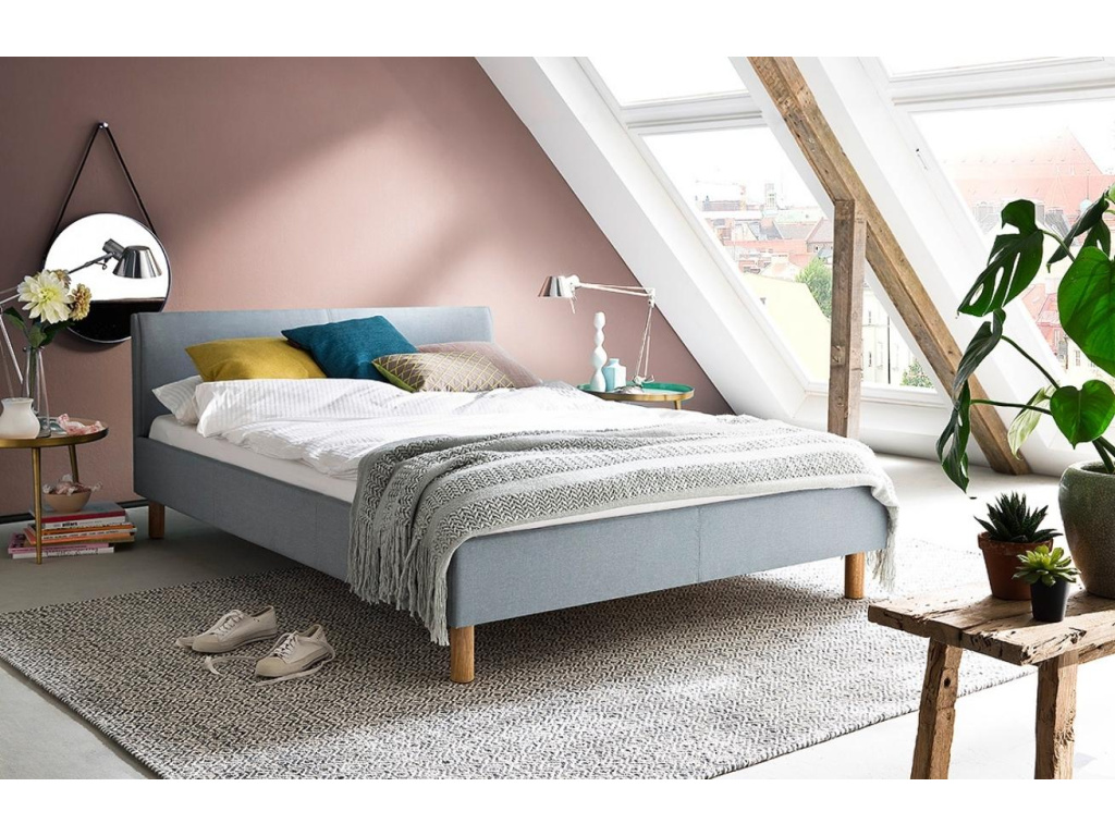 Stylová jeden a půl lůžková postel Lotte od značky Meise Möbel zaujme na první pohled svým vzhledem. Příjemné látkové čalounění ve světle modré barvě vytváří v kombinaci s masivní dubovou podnoží jedinečný kontrast, který do vašeho interiéru vnese trendy prvek. Postel se skvěle hodí do moderních interiérů.