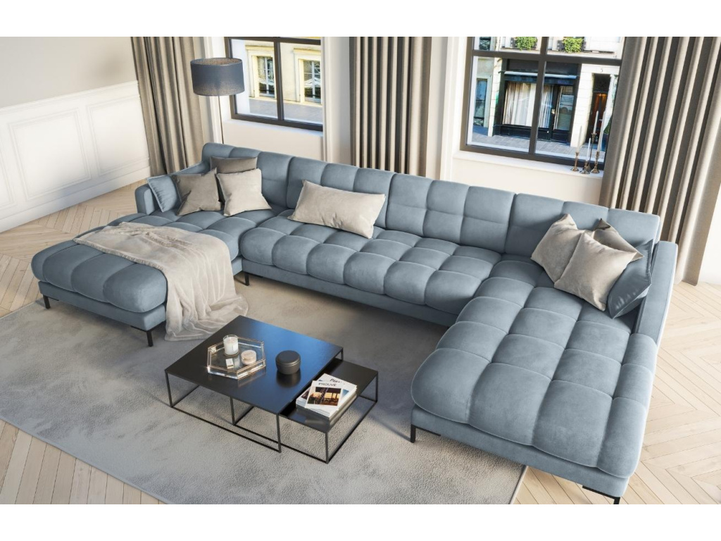 Elegantní šestimístná rohová pohovka MICADONI MAMAIA zaujme na první pohled svým nadýchaným vzhledem. Velmi příjemné sametové čalounění v světle modré barvě a kovová podnož vytváří kontrast, který interiéru dodá elegantní vzhled a nádech luxusu. Díky zajímavému prošívání vzniká jemný design, který do vašeho domova vnese lehkost a styl. Opěrné polštářky zvednou úroveň vašeho odpočinku o stupeň výš. Díky praktickému tvaru do písmene U získáte rovnoměrně rozdělená místa k odpočinku. Nechte se obklopit komfortem ve společnosti produktů Mamaia.