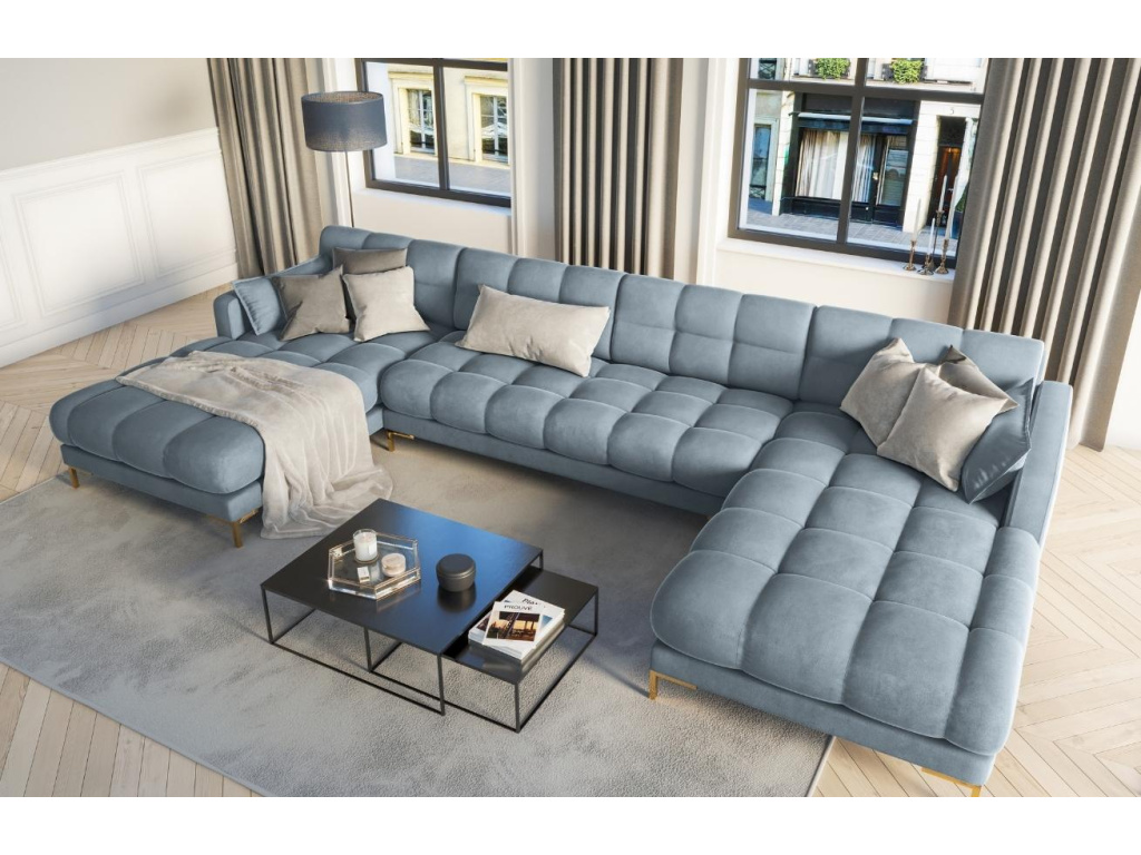Elegantní šestimístná rohová pohovka MICADONI MAMAIA zaujme na první pohled svým nadýchaným vzhledem. Velmi příjemné sametové čalounění ve světle modré barvě a kovová podnož vytváří kontrast, který interiéru dodá elegantní vzhled a nádech luxusu. Díky zajímavému prošívání vzniká jemný design, který do vašeho domova vnese lehkost a styl. Opěrné polštářky zvednou úroveň vašeho odpočinku o stupeň výš. Díky praktickému tvaru do písmene U získáte rovnoměrně rozdělená místa k odpočinku. Nechte se obklopit komfortem ve společnosti produktů Mamaia.