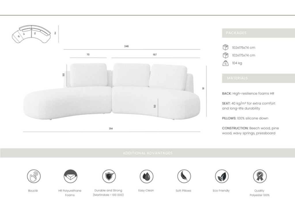 Rohová pohovka Devichy Bonnie je jedinečný a přitažlivý kus nábytku, který má nejen příjemný vzhled, ale také poskytuje velké pohodlí při používání. Svým tvarem odpovídá současným interiérovým trendům. Pohovka kombinuje japonské a skandinávské designové prvky pro estetiku. Bonnie má organický tvar, který činí pohovku velmi působivou a dominantní. Díky inovativní kombinaci výplňových pěn je pohovka mimořádně pohodlná. Pohovka je čalouněná kvalitní bouclé látkou, která je velice příjemná na dotek a je charakteristická svou nadprůměrnou odolností (ZERO SPOT SYTEM). Zrelaxujte ve společnosti pohovek Bonnie a dodejte svému odpočinku jiný rozměr.