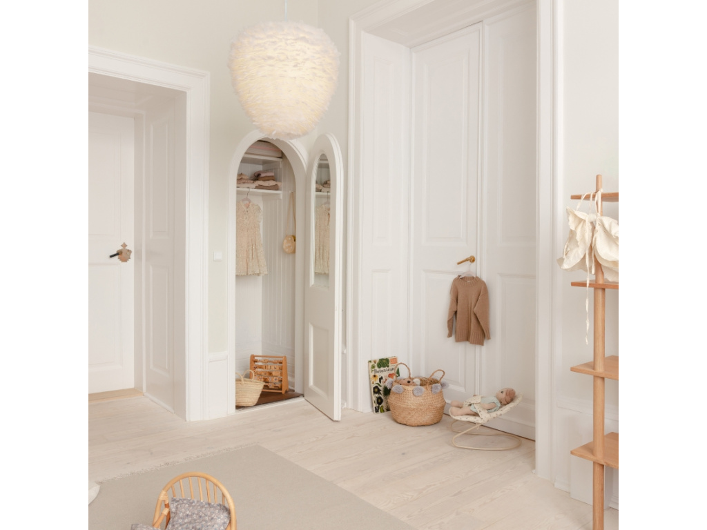 Závěsné stínidlo Eos Evia čerpá svou sílu a fascinující krásu z měkkého peří, které do domova vnáší hřejivou atmosféru. Toto jedinečné a ručně vyrobené stínidlo z čistě přírodního husího peří nabízí měkké, teplé světlo a dodá každému interiéru sofistikovaný a elegantní nádech. Eos je flexibilní stínidlo, které lze použít jako stojací, stolní nebo závěsnou lampu. Všechna stínidla Eos jsou k dispozici v neutrální a harmonické paletě barev pro vytvoření teplé a přívětivé atmosféry domova.