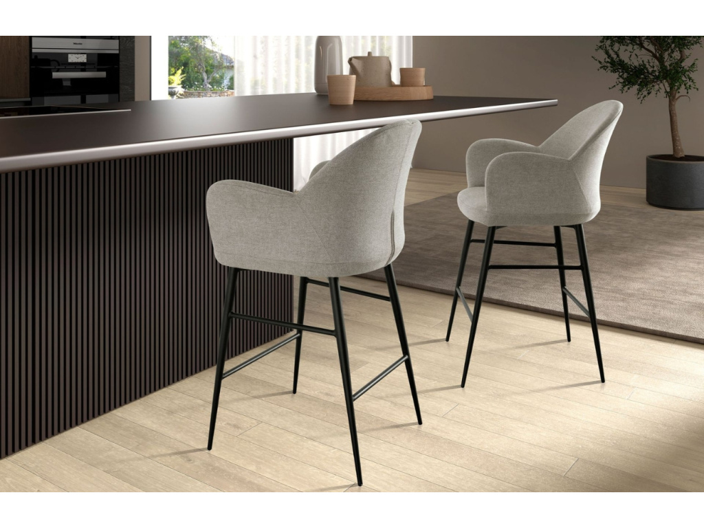 Dodejte své kuchyni moderní šmrnc s barovou židlí Angel Cerdá čalouněnou světle šedou látkou, která v sobě dokonale snoubí elegantní design, pohodlí a nadčasovou originalitu. Tato barová židle s područkami a jemně tvarovaným opěradlem je navržena s důrazem na styl a funkčnost, takže se stane nepostradatelným prvkem každého moderního interiéru. Její štíhlé nohy z černě lakované nerezové oceli dodávají konstrukci vizuální lehkost, stabilitu a zároveň vytvářejí výrazný kontrast k měkkému textilu sedáku. Barová židle Angel Cerdá je důkazem toho, že funkčnost a design jdou ruku v ruce. Elegantní, pevná a s osobitým charakterem – přesně taková je tato židle, která se stane přirozeným středobodem vaší domácnosti.