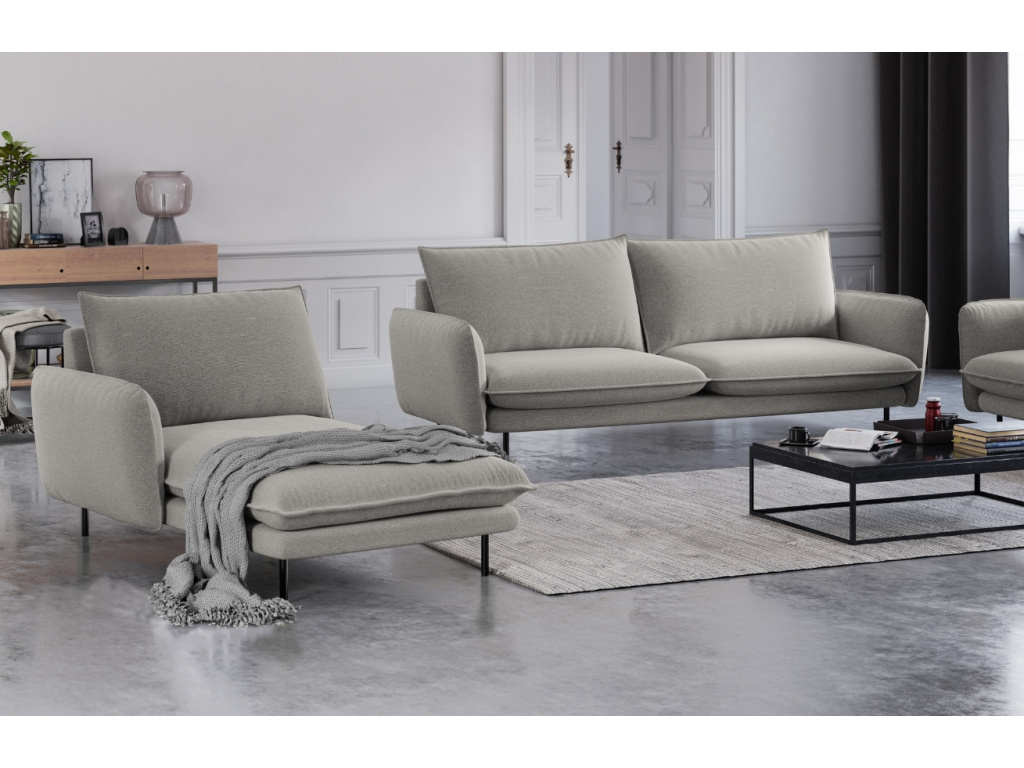 Lenoška Vienna od Cosmopolitan Design je poctou nadčasové eleganci, smyslu pro detail a dokonale vyváženým proporcím. Její jemně tvarované opěrky, měkký sedák a ladná silueta jí propůjčují vizuální lehkost, která zaujme na první pohled – a ještě více při posezení. Kontrastní černě lakovaná kovová podnož dodává celku vizuální vzdušnost a současně zajišťuje stabilitu. O vaše maximální pohodlí se postará čalounění ze strukturované látky s výraznou texturou – příjemnou na dotek, vizuálně zajímavou a zároveň mimořádně odolnou vůči každodennímu používání. Vienna vždy zapadne s lehkostí a zároveň dodá prostoru výraz. Skvěle se uplatní jako solitér pro chvíle klidu, stejně jako součást větší sedací sestavy. A právě tu můžete vytvořit s celou kolekcí Vienna, která kromě křesel nabízí také elegantní pohovky a pohodlná křesla – ideální pro ty, kteří chtějí styl i komfort dotáhnout do posledního detailu.