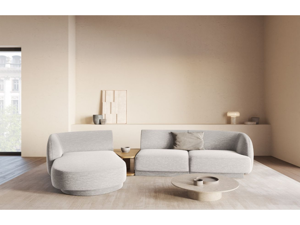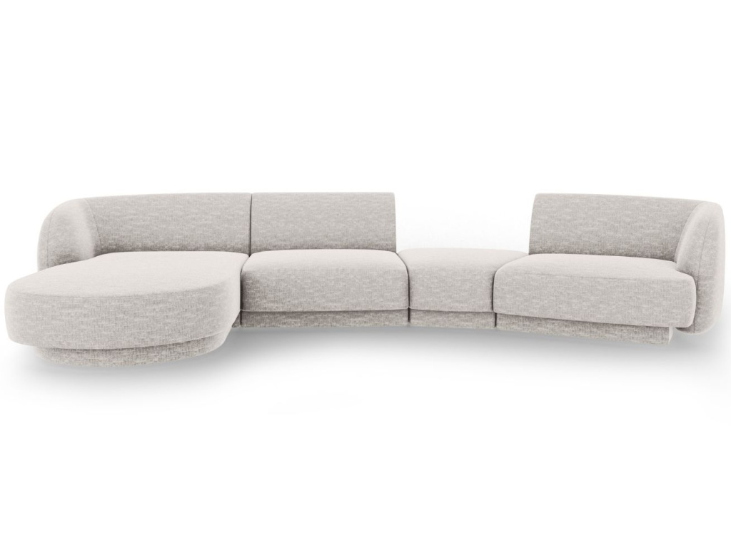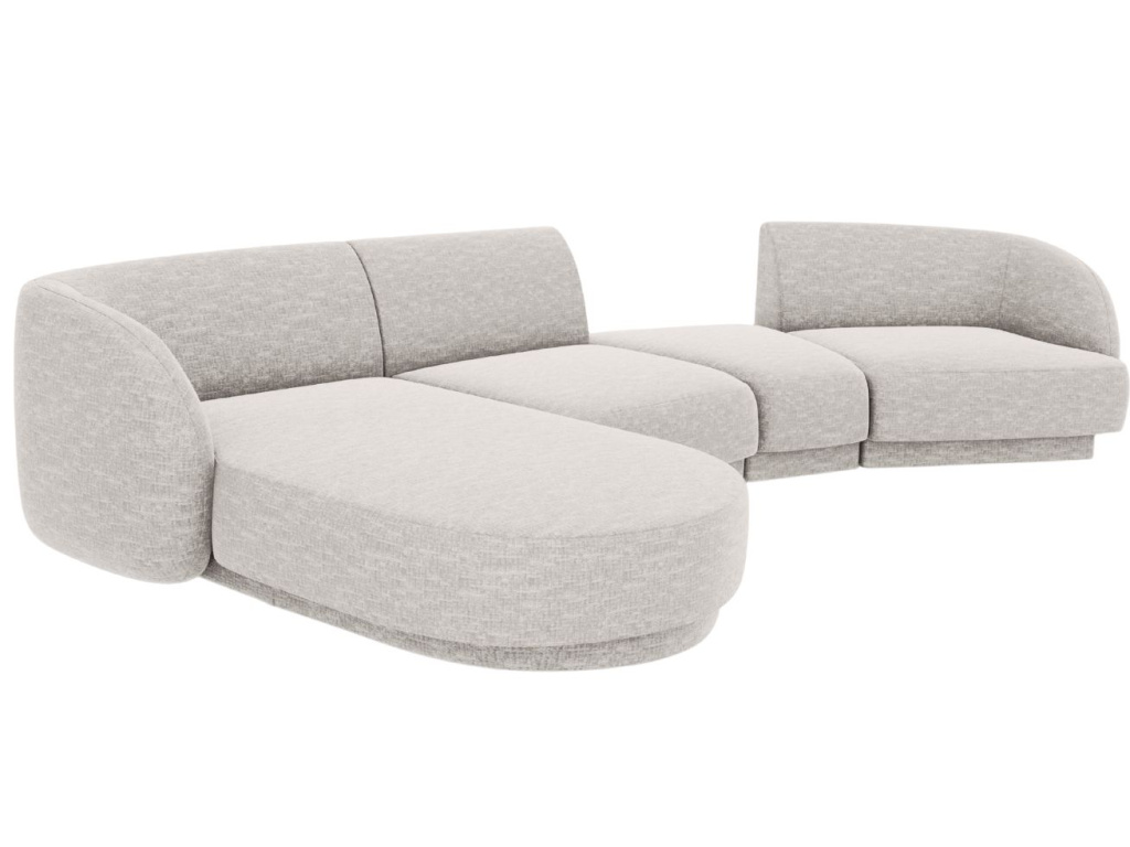 Čtyřmístnou rohovou pohovku Miley od značky Micadoni si zamilujete! Její elegantně obloukovité opěradlo vás doslova zve k odpočinku, zatímco jemně zapuštěná základna dodává celému kusu vzdušnost a lehkost. Žinylková potahová látka je velmi příjemná až téměř hedvábná na dotek. Probarvené nitě vytvářejí poutavou 3D strukturu se stínovým a lesklým efektem. Tkanina je velmi odolná proti oděru, díky tomu je pohovka vhodná i do komerčních prostor. Vysoká kvalita a neobyčejný vzhled látky dodávají nábytku sofistikovaný dojem, který umožňuje jeho široké využití v moderním nebo skandinávském stylu. Integrovaný konferenční stolek je nejen designovým prvkem, ale také praktickým místem pro odložení věcí, které chcete mít po ruce, nebo pro umístění dekorací. K pohovce je možné přikoupit další produkty z kolekce Miley. Díky tomu si můžete vytvořit sedací soupravu, kterou je vhodné kombinovat se skleněným nebo dřevěným konferenčním stolkem.