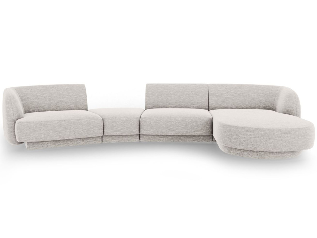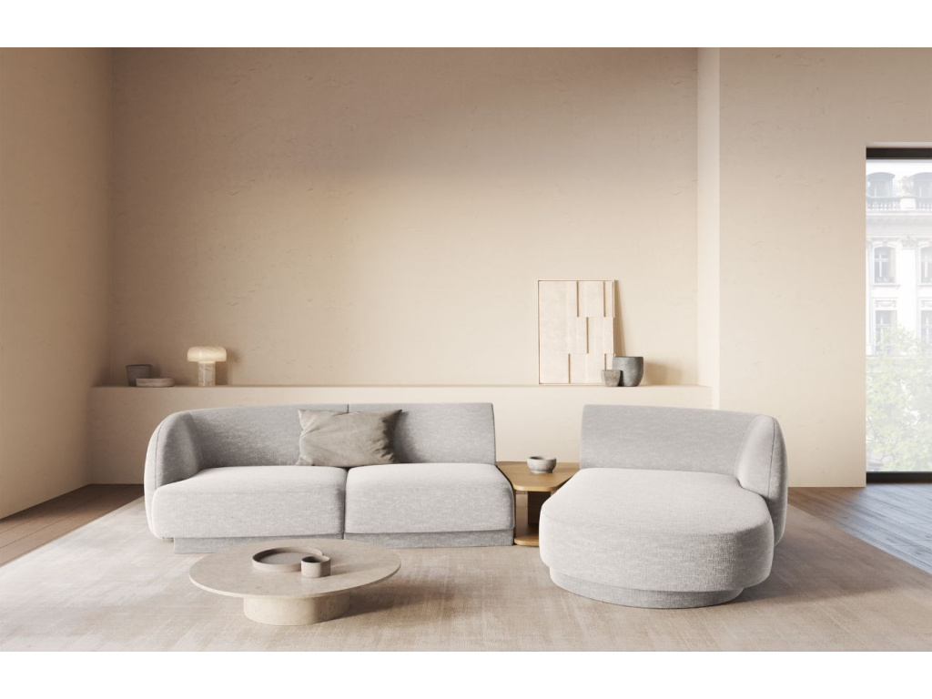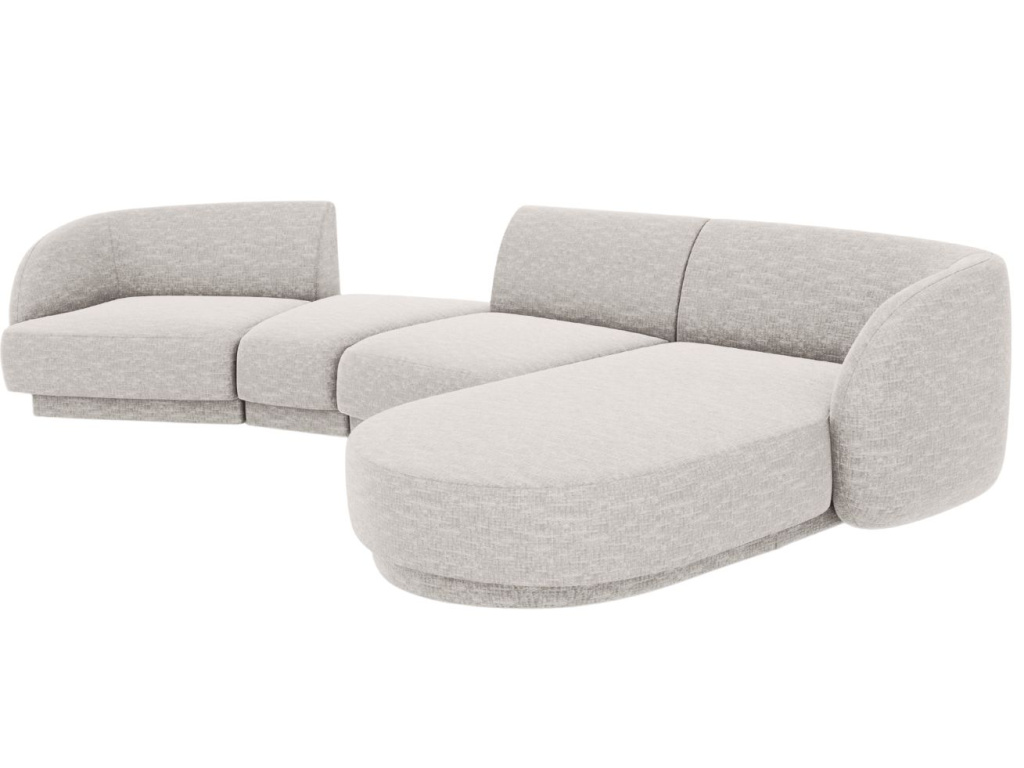 Čtyřmístnou rohovou pohovku Miley od značky Micadoni si zamilujete! Její elegantně obloukovité opěradlo vás doslova zve k odpočinku, zatímco jemně zapuštěná základna dodává celému kusu vzdušnost a lehkost. Žinylková potahová látka je velmi příjemná až téměř hedvábná na dotek. Probarvené nitě vytvářejí poutavou 3D strukturu se stínovým a lesklým efektem. Tkanina je velmi odolná proti oděru, díky tomu je pohovka vhodná i do komerčních prostor. Vysoká kvalita a neobyčejný vzhled látky dodávají nábytku sofistikovaný dojem, který umožňuje jeho široké využití v moderním nebo skandinávském stylu. Integrovaný konferenční stolek je nejen designovým prvkem, ale také praktickým místem pro odložení věcí, které chcete mít po ruce, nebo pro umístění dekorací. K pohovce je možné přikoupit další produkty z kolekce Miley. Díky tomu si můžete vytvořit sedací soupravu, kterou je vhodné kombinovat se skleněným nebo dřevěným konferenčním stolkem.
