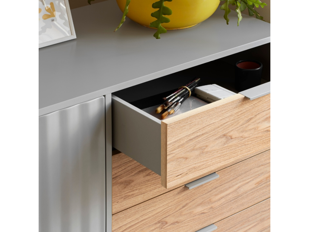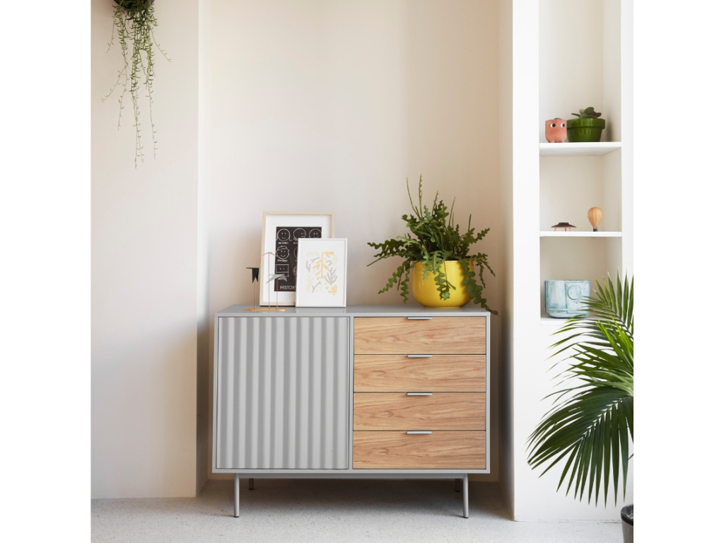 Stylová komoda Teulat Sierra zaujme na první pohled svým minimalistickým designem a harmonikovým vystouplým vzorem na předních dvířkách. Komoda je vyrobena z lakovaného MDF v elegantní šedé barvě, která krásně kontrastuje s přední stranou zásuvek z dubové dýhy. Celý korpus doplňuje tenká kovová podnož. Komoda disponuje praktickým úložným prostorem ve formě uzavřených polic a čtyř zásuvek. Komoda Sierra vynikne zejména v moderně laděných interiérech.
