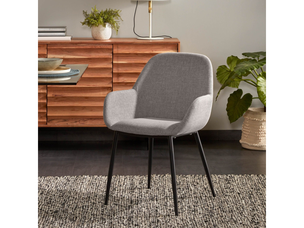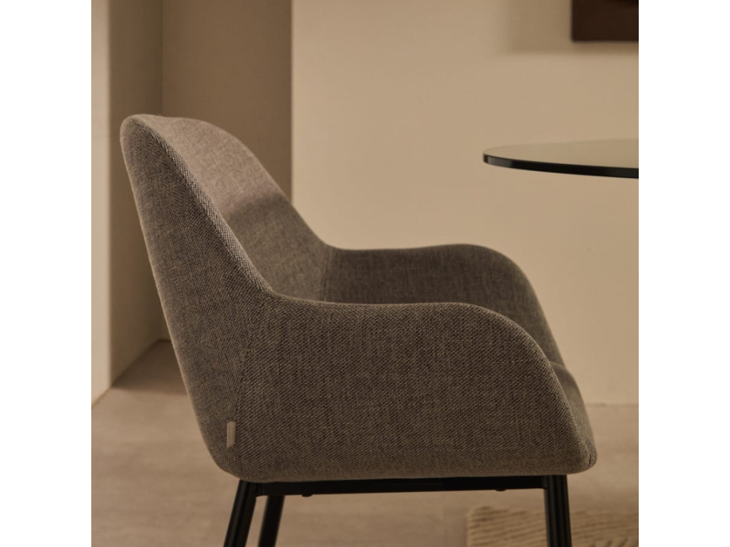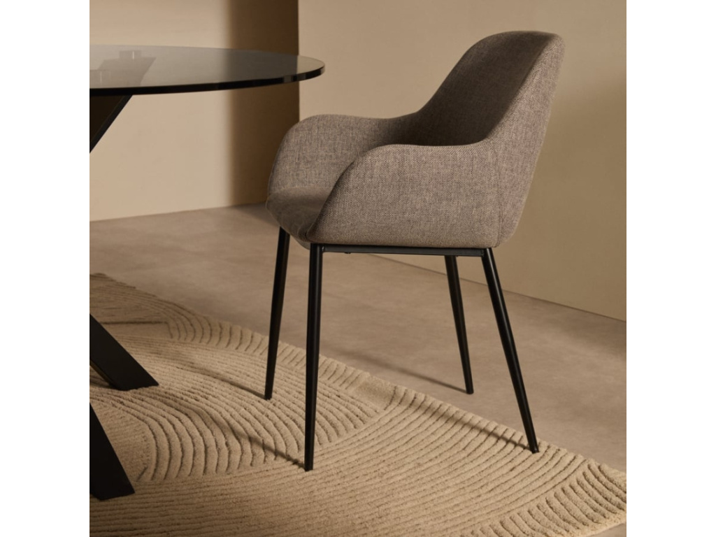 Stylová jídelní židle Kave Home Konna zaujme svým jedinečným retro designem. Příjemné látkové čalounění ve světle šedé barvě vytváří v kombinaci s černě lakovanou kovovou podnoží atraktivní kontrast, díky čemuž je tato židle neotřelým kouskem nábytku. Díky praktickým područkám získáte maximální komfort a prožitek z posezení. Židle zaujme skvělé místo v klasických i moderních interiérech.