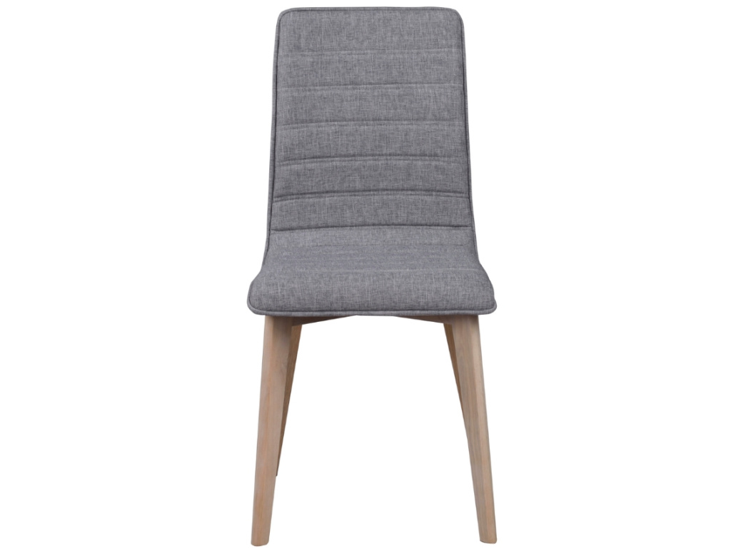 Kompaktní jídelní židle ROWICO GRACY díky svému modernímu designu skvěle zapadne do moderních interiérů v rustikálním i scandi stylu. Židle je čalouněná látkou světle šedé barvy a čalounění je na přední straně ozvláštněno výraznými široké pruhy. Podnož židle tvoří masívní dubové dřevo v běleném provedení.