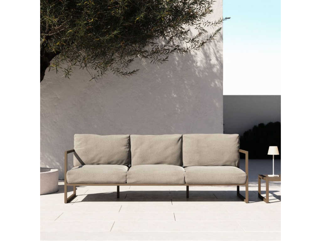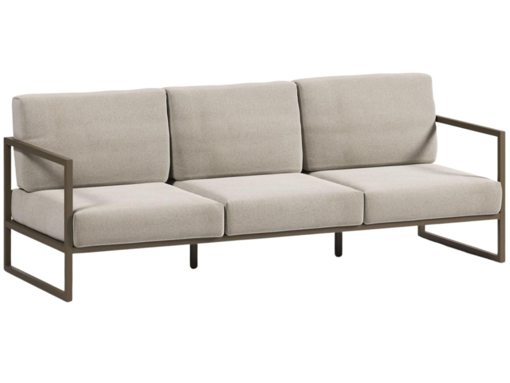 Trojmístná zahradní pohovka Comova značky Kave Home je tvořena hliníkovou konstrukcí hnědo zelené barvy. Ta je doplněna sedákem a opěradlem čalouněným odolnou látkou světle šedé barvy. Skvěle se hodí do venkovních prostor, využít ji můžete například u bazénu nebo na terase - zkrátka kdekoliv, kde si chcete dopřát pohodlné posezení a chvilku odpočinku. Svým moderním designem dodá každému posezení styl - zvláště, pokud ji doplníte dalšími produkty ze stejnojmenné série zahradního nábytku. Dostupná je ve čtyřech barevných variantách. Můžete ji mít také v dvojmístném provedení.