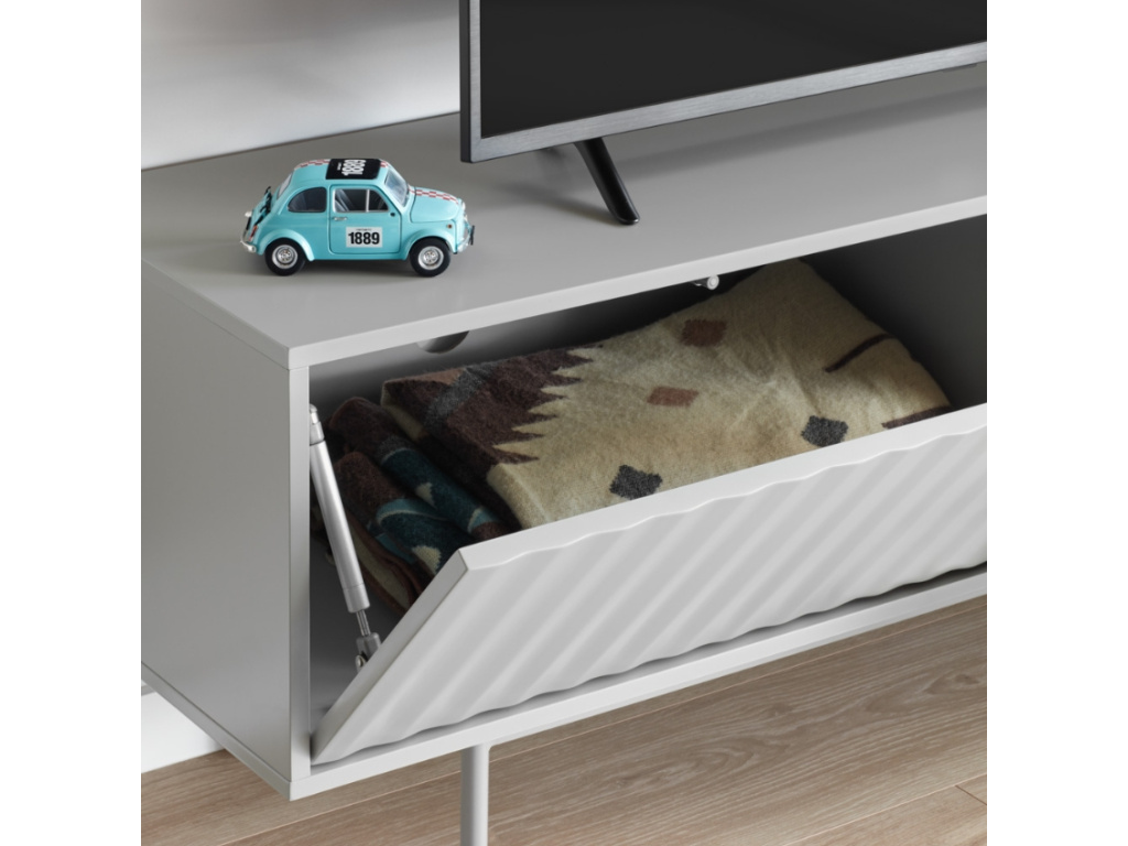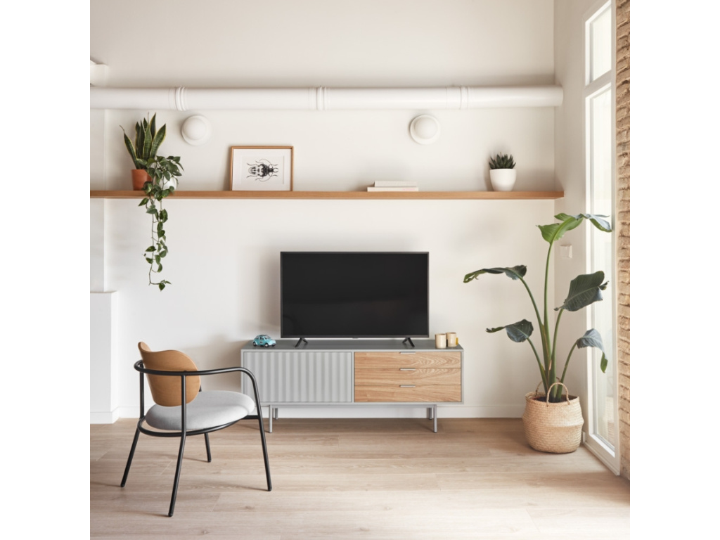Stylový TV stolek Teulat Sierra zaujme na první pohled svým minimalistickým designem a harmonikovým vystouplým vzorem na předních dvířkách. Komoda je vyrobena z lakovaného MDF v elegantní šedé barvě, která krásně kontrastuje s přední stranou zásuvek z dubové dýhy. Celý korpus doplňuje tenká kovová podnož. Stolek disponuje praktickým úložným prostorem ve formě uzavřených polic a tří zásuvek. Teulat Sierra vynikne zejména v moderně laděných interiérech.