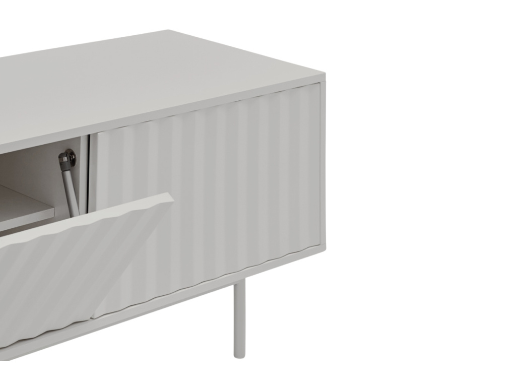Stylový TV stolek Teulat Sierra zaujme na první pohled svým minimalistickým designem a harmonikovým vystouplým vzorem na předních dvířkách. Stolek je vyrobena z lakovaného MDF v elegantní šedé barvě. Celý korpus doplňuje tenká kovová podnož. Stolek disponuje praktickým úložným prostorem ve formě uzavřených polic. Sierra vynikne zejména v moderně a minimalisticky laděných interiérech.
