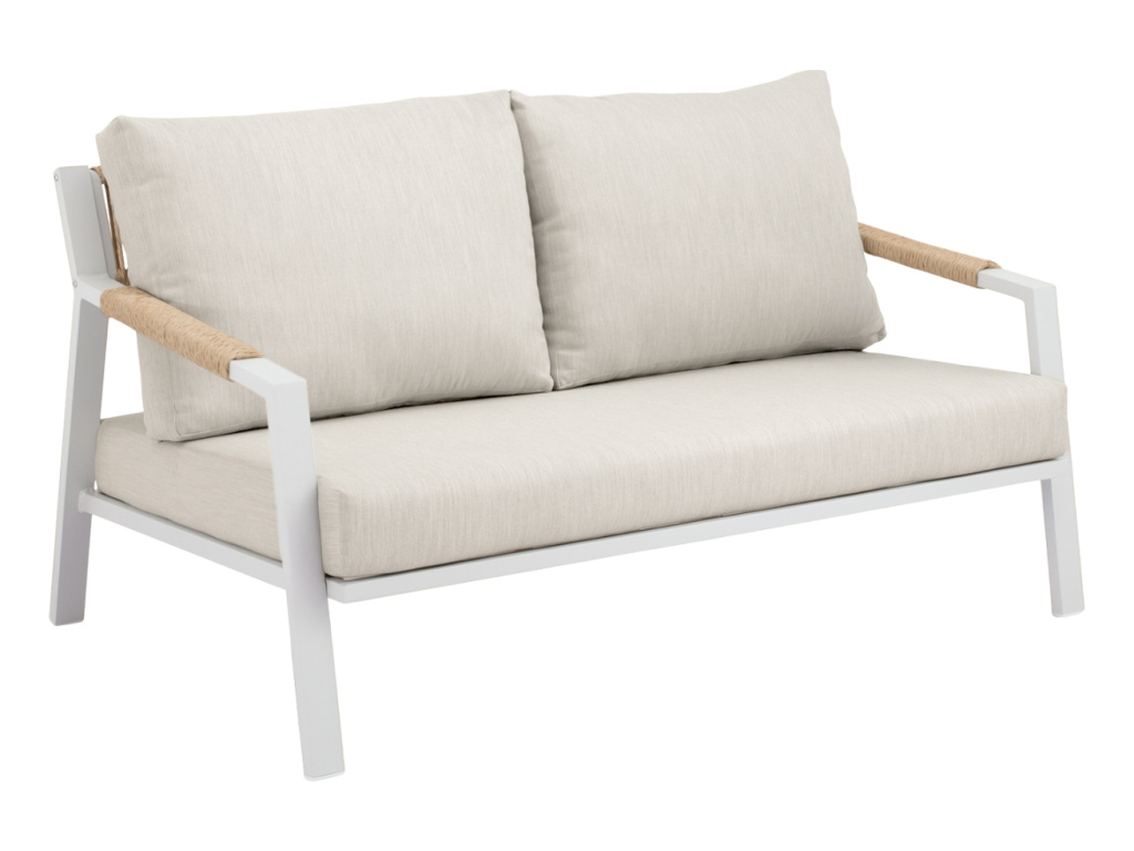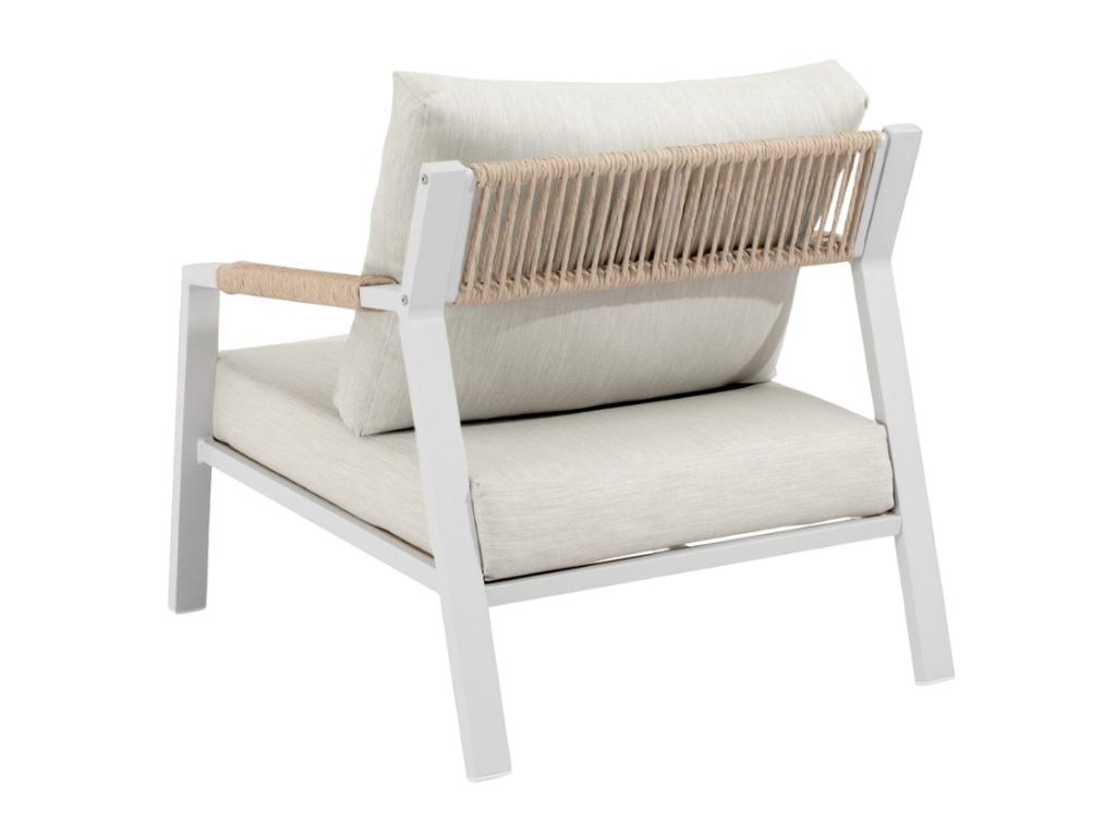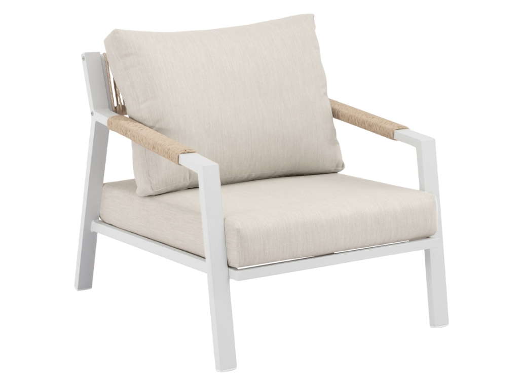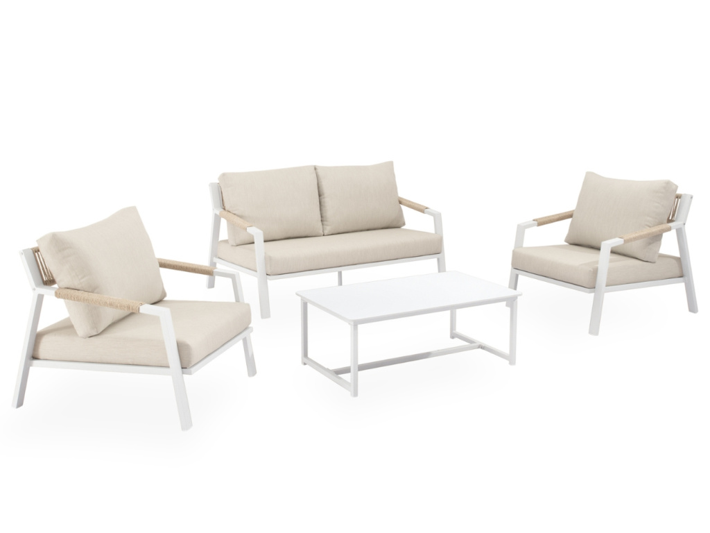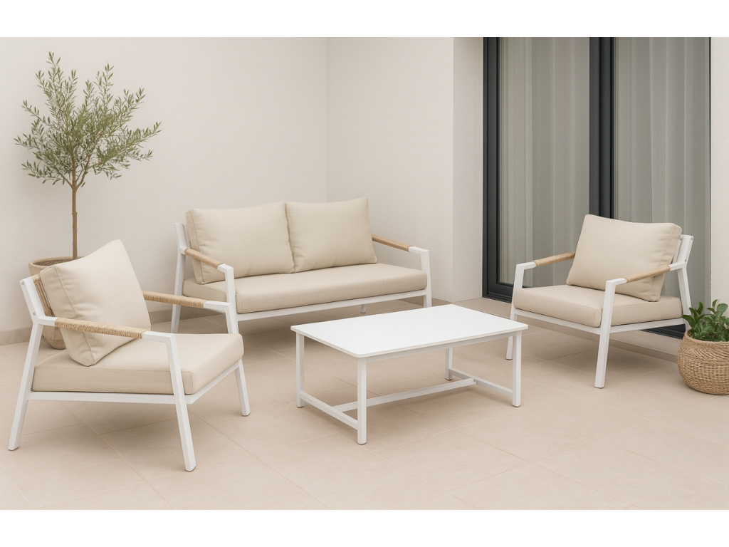 Zahradní set Muscat přináší do venkovního prostoru sofistikovaný a moderní vzhled s čistými liniemi. Sestava zahrnuje dvě prostorná křesla, dvoumístnou pohovku a konferenční stolek s bílou porcelánovou deskou, která působí elegantně a odlehčeně. Matně bílá hliníková konstrukce je doplněna o detaily z výpletu v přírodním dekoru a pohodlné světle šedé polštáře, které podtrhují stylový minimalismus. Sestava Muscat je ideální volbou pro ty, kteří hledají funkční komfort s vytříbeným designem na terasu, balkon či zahradu.