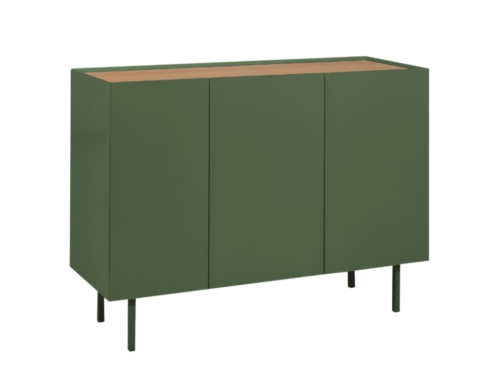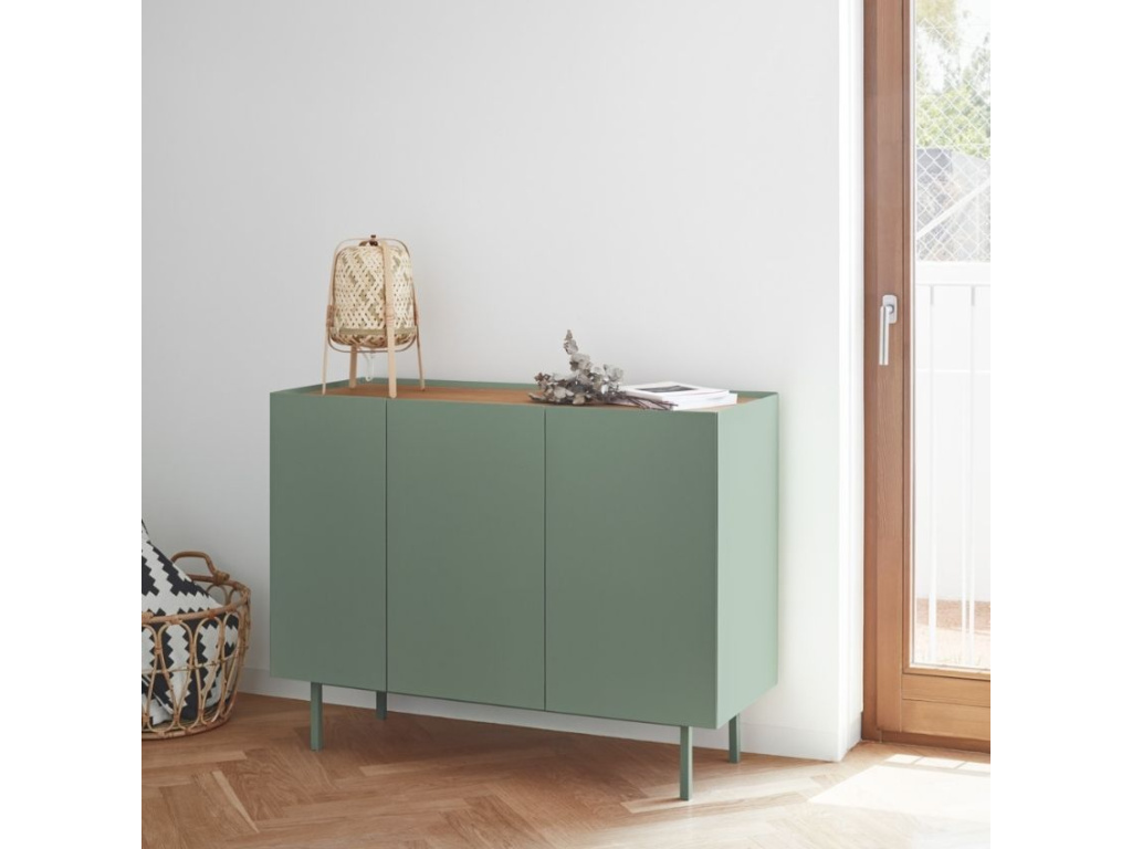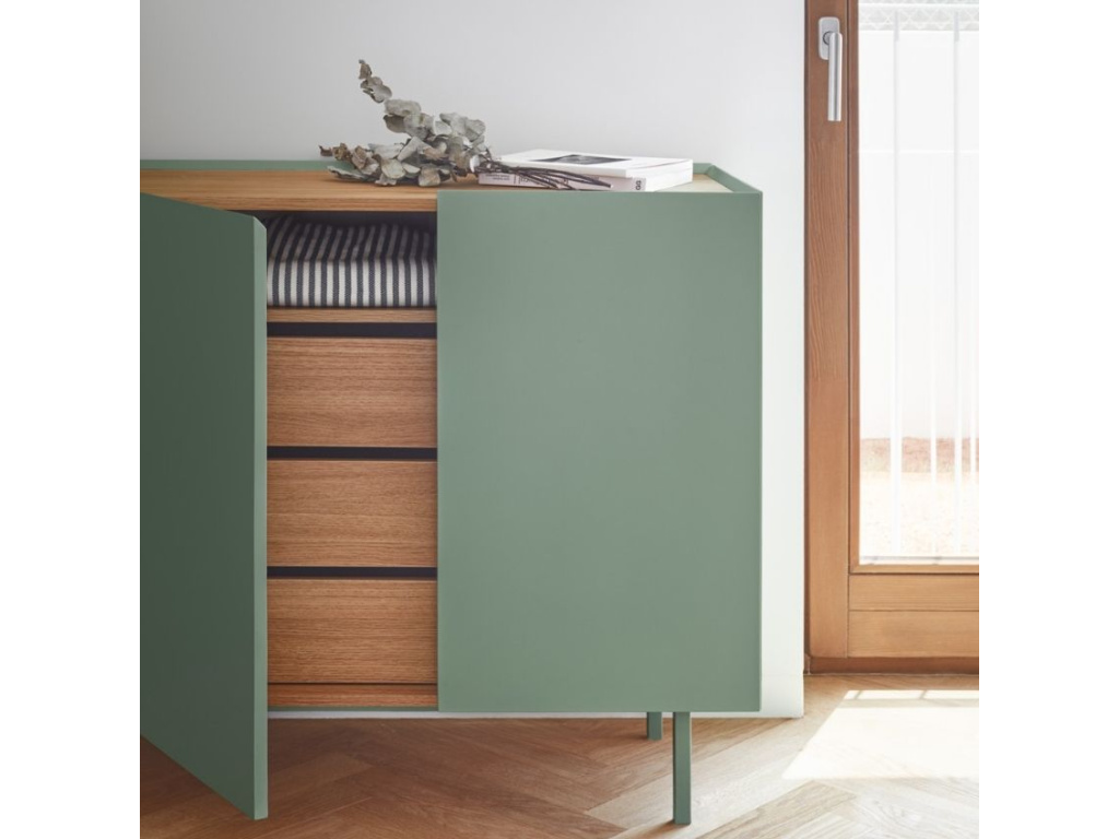 Komoda Teulat Arista bude stylovou ozdobou každého moderního interiéru obývacího pokoje i ložnice. Dominantní světle zelená barva podtrhuje minimalistický design této komody, se kterým kontrastuje vrchní deska s dubovou dýhou v přírodním odstínu. Úložný prostor je prakticky rozčleněn do polic a výsuvných zásuvek, což vám bude ulehčovat organizaci vašeho inventáře. Moderní styl komody podtrhuje tenká lakovaná kovová podnož, která barevně ladí se zbytkem komody.