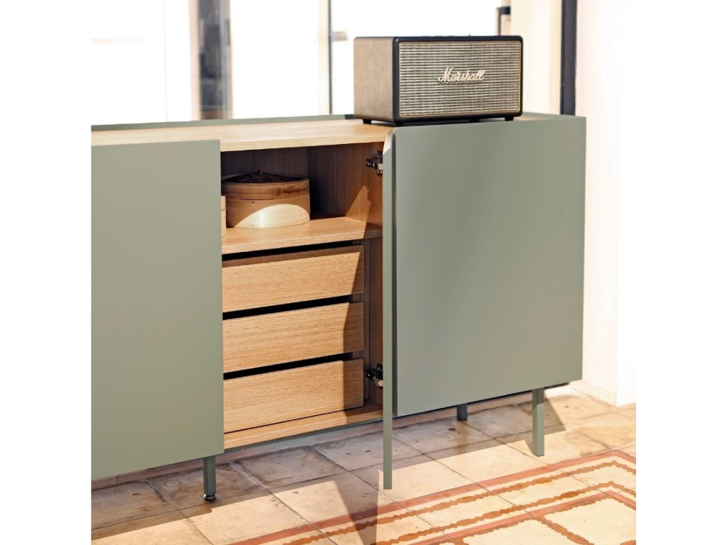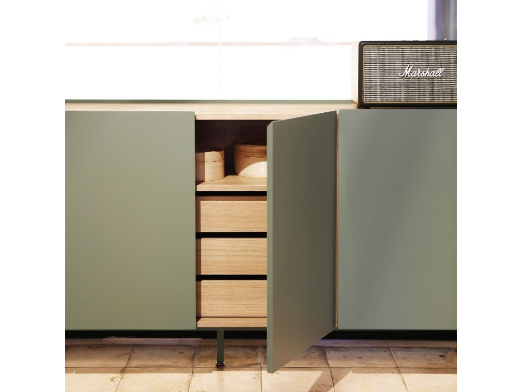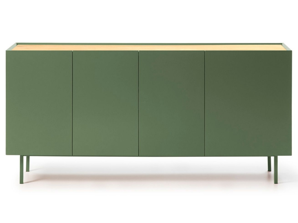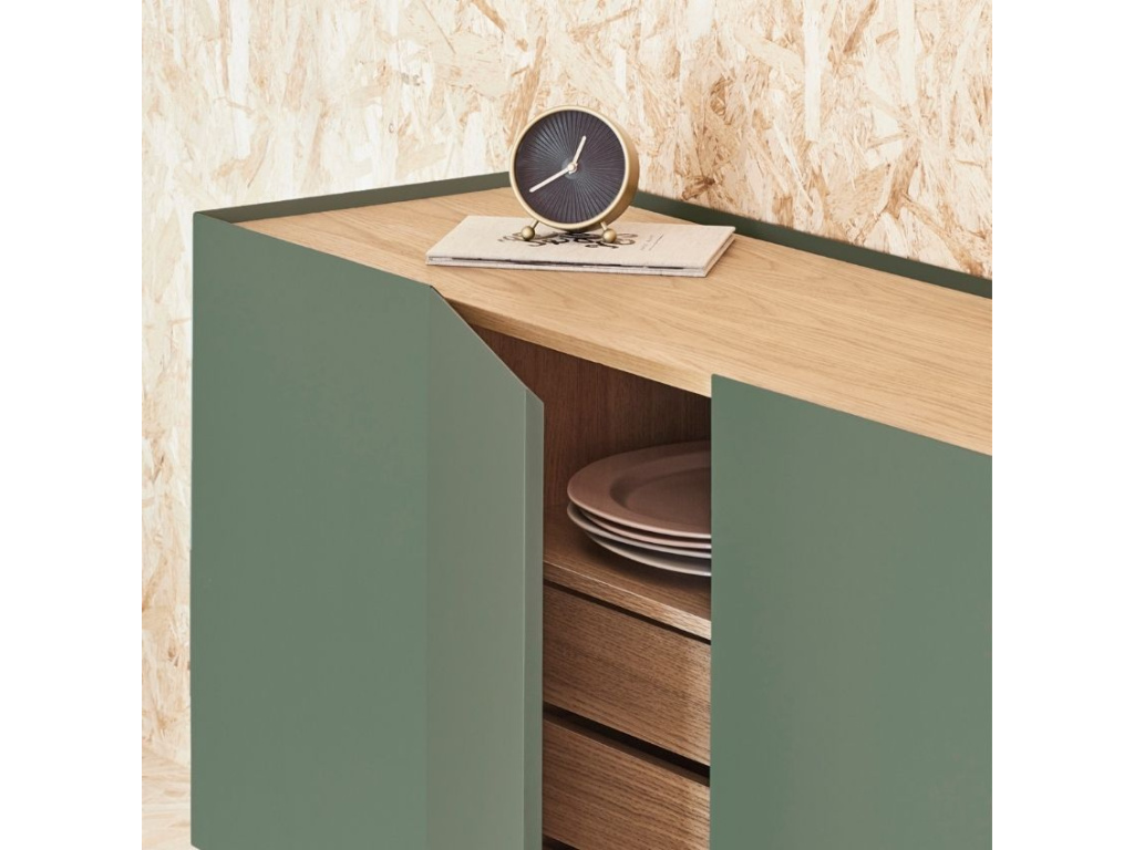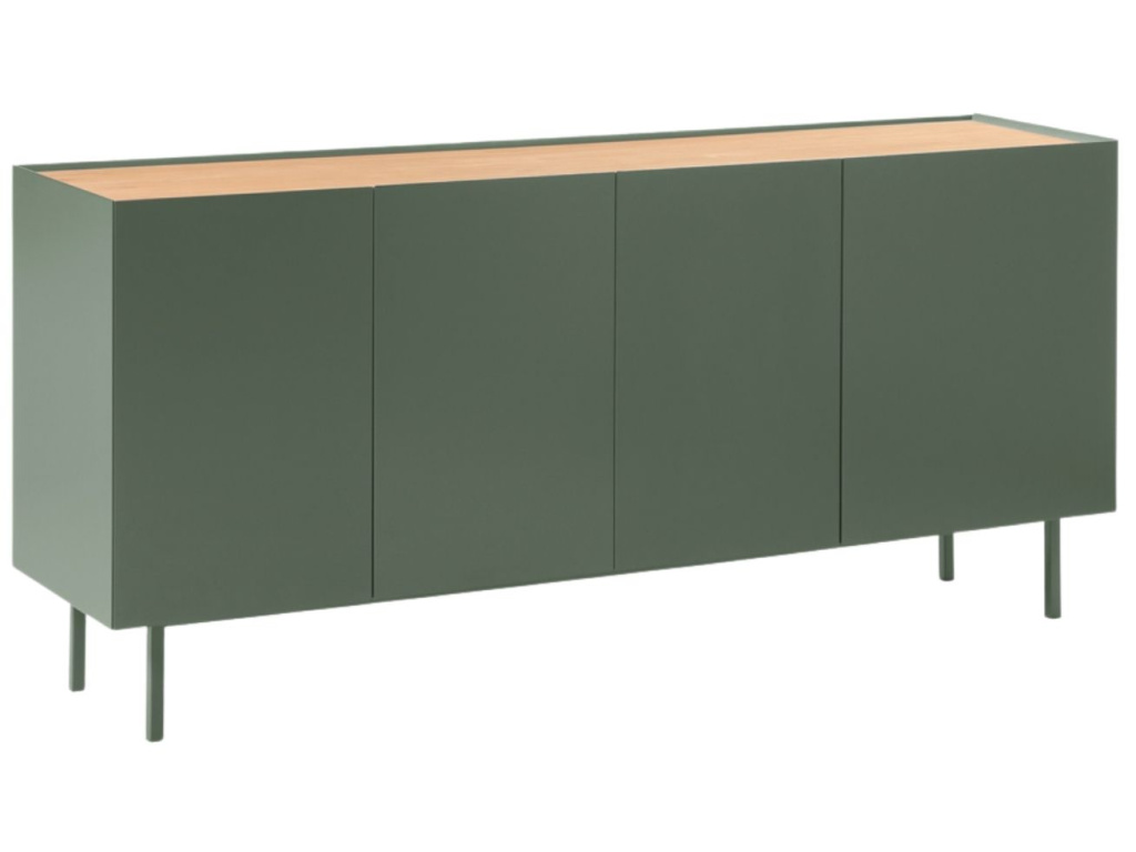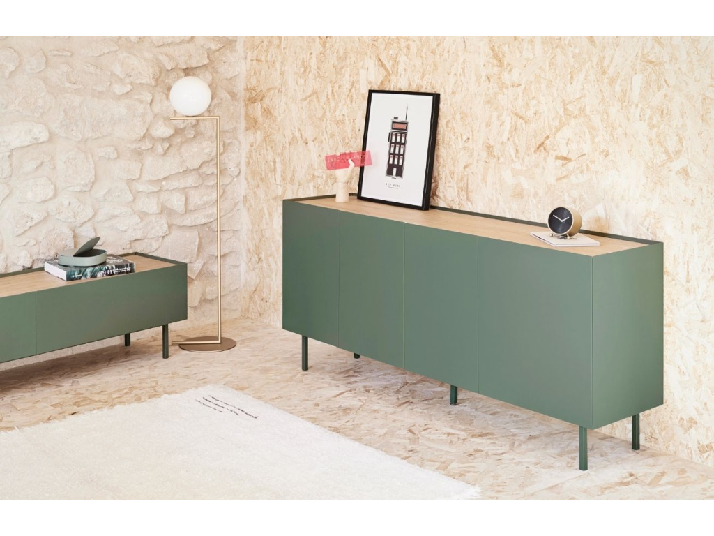 Komoda Teulat Arista bude stylovou ozdobou každého moderního interiéru obývacího pokoje i ložnice. Dominantní světle zelená barva podtrhuje minimalistický design této komody, se kterým kontrastuje vrchní deska s dubovou dýhou v přírodním odstínu. Úložný prostor je prakticky rozčleněn do polic a výsuvných zásuvek, což vám bude ulehčovat organizaci vašeho inventáře. Moderní styl komody podtrhuje tenká lakovaná kovová podnož, která barevně ladí se zbytkem komody.