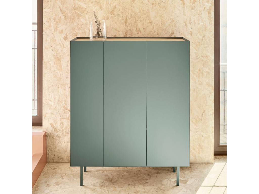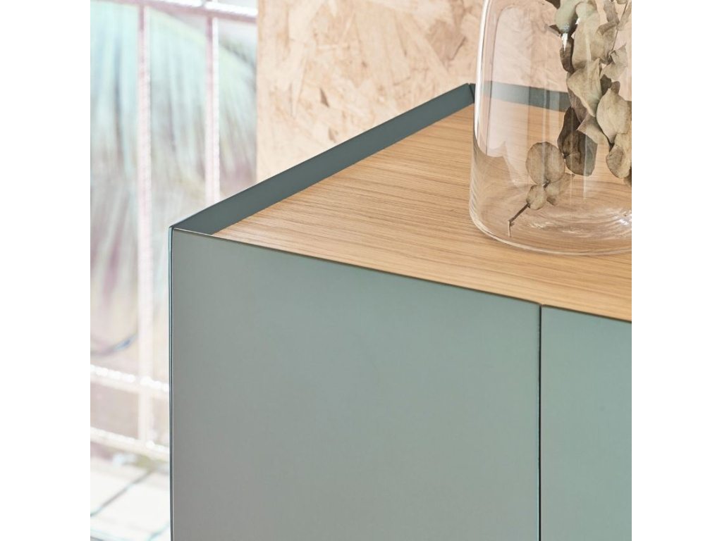 Komoda Teulat Arista bude stylovou ozdobou každého moderního interiéru obývacího pokoje i ložnice. Dominantní světle zelená barva podtrhuje minimalistický design této komody, se kterým kontrastuje vrchní deska s dubovou dýhou v přírodním odstínu. Úložný prostor je prakticky rozčleněn do polic, což vám bude ulehčovat organizaci vašeho inventáře. Teulat Arista má navíc i speciální přihrádky na víno, a komoda tak může sloužit i jako vinotéka. Moderní styl komody podtrhuje tenká lakovaná kovová podnož, která barevně ladí se zbytkem komody.