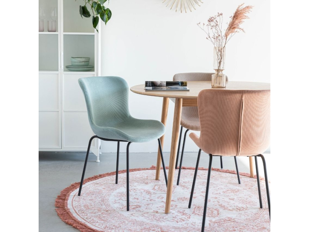 Jídelní židle JUNZO je čalouněná příjemnou manšestrovou látkou, díky které skvěle ozvláštní každý jídelní stůl. Manšestrové čalounění je vkusně doplněno podnoží z černě lakované oceli, která zajišťuje potřebnou stabilitu a pevnost židle. JUNZO nemusí být umístěna jen do jídelny, skvěle se hodí také k toaletnímu stolku nebo do pracovny. Dostupná je v několika barevných variantách.