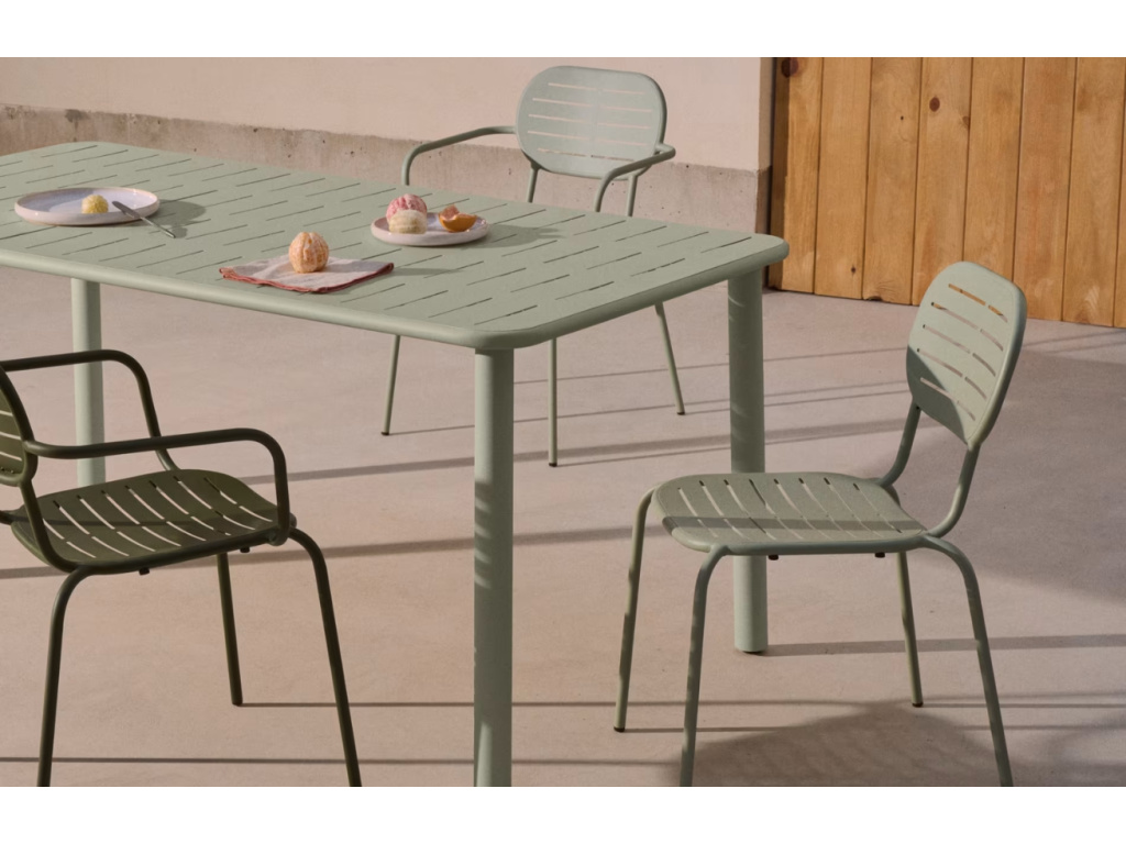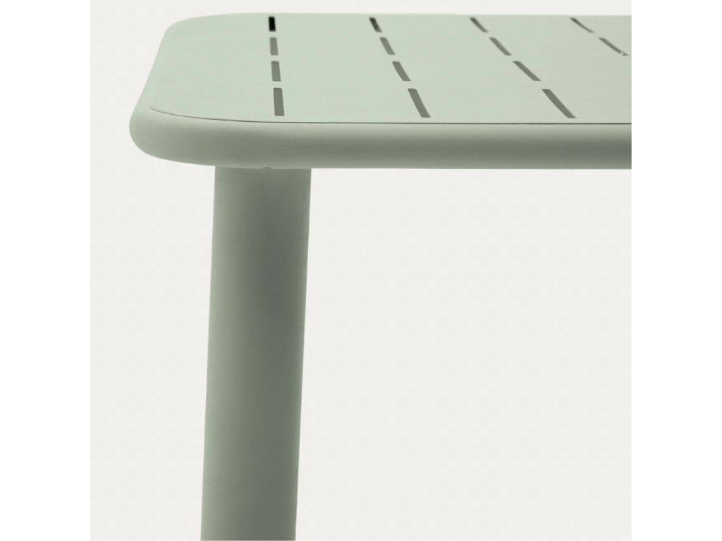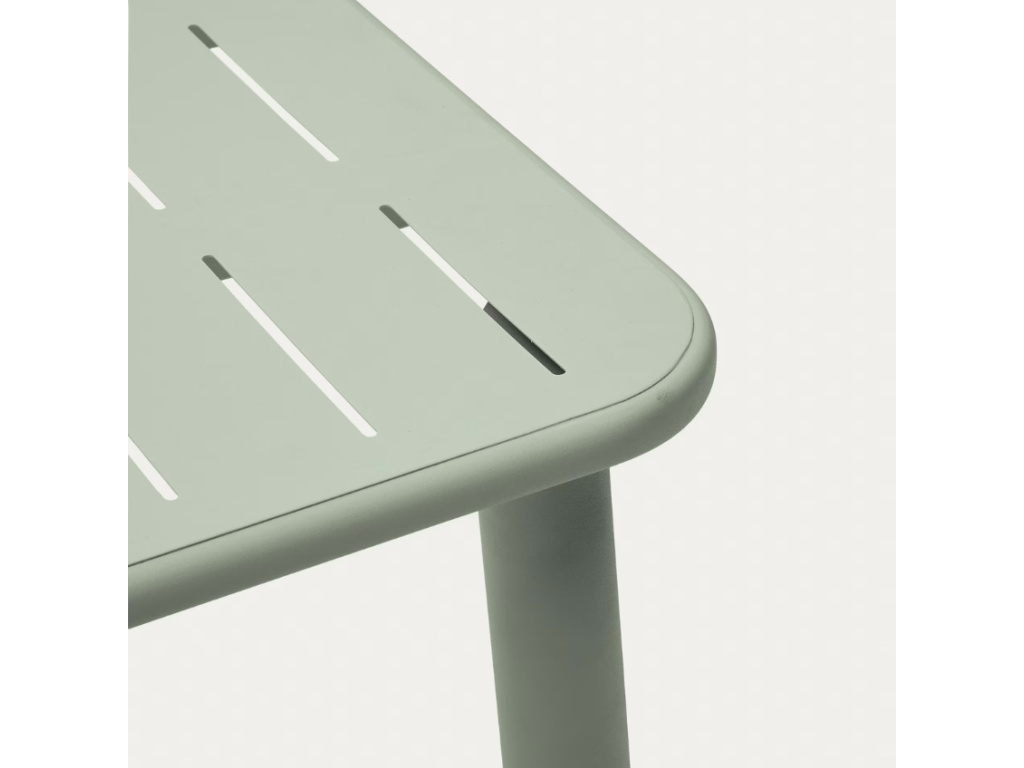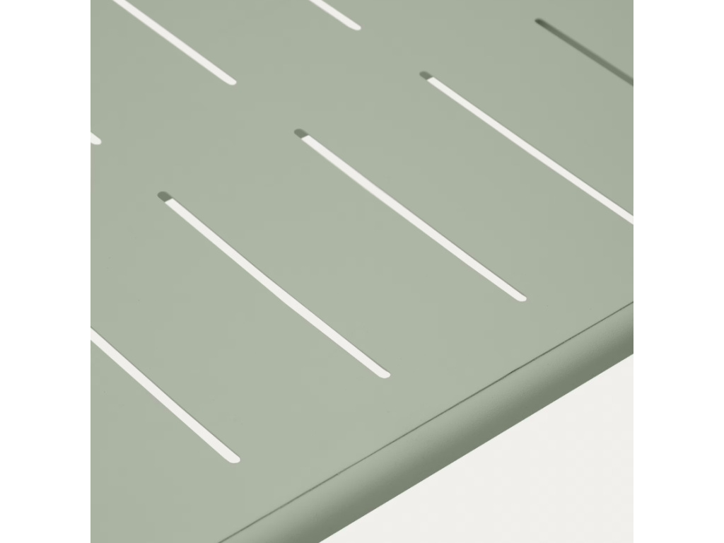 Kolekce zahradního nábytku Brai od značky Kave Home vyniká minimalistickým designem s oblými tvary a jemnými drážkami, které poskytují vizuální lehkost a současně praktičnost. Stůl v pastelově zeleném odstínu je vyroben z pozinkované oceli, která je vůči oděru a korozi odolnější než běžná ocel. Podnož je opatřena plastovými chrániči, které chrání podlahu před poškrábáním. K dispozici je také varianta s čtvercovou deskou a několik barevných provedení pro dokonalé sladění s vaší terasou či zahradou.